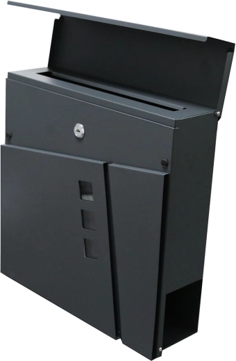 Moderne brievenbus TILES in elegante antracietkleur voor het veilig ontvangen van post. Biedt inworp van boven, een cilinderslot met 2 sleutels en eenvoudige montage inclusief schroeven en pluggen. Aan de onderzijde bevindt zich een praktische koker voor kranten en folders.