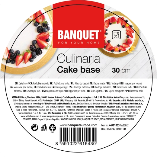 Elegante ronde taartonderlegger met een diameter van 30 cm, gemaakt van meerdere lagen stevig karton met een dikte van 3 mm. Aan beide zijden bekleed met goudfolie voor waterbestendigheid en vetwerendheid. Ideaal voor decoreren, serveren en verplaatsen van taarten met gegarandeerde stabiliteit en een representatieve uitstraling.