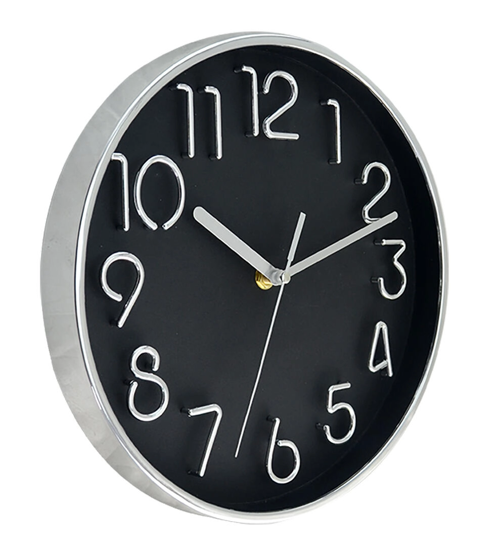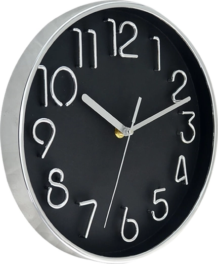Stijlvolle wandklok met een diameter van 30 cm, waarin glas, metaal en hoogwaardig kunststof worden gecombineerd voor een moderne look in elk interieur. Dankzij de 3D-cijferplaat en het contrast van zilverkleurige cijfers op een zwarte achtergrond is de tijd ook van een afstand uitstekend leesbaar. De stille werking zonder nadrukkelijk getik zorgt voor rust in woonkamer, slaapkamer en kantoor.