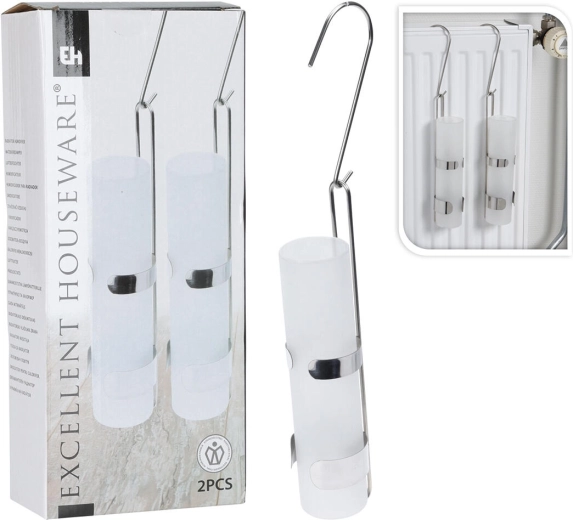 Praktische ronde radiatorverdamper met een inhoud van 325 ml van glas en roestvrij staal verhoogt effectief de luchtvochtigheid tijdens het stookseizoen. Helpt droge en prikkelende lucht in de ruimte te verminderen, verbetert het binnenklimaat in woning en huis en draagt bij aan comfortabeler ademen. De verpakking bevat 2 stuks voor meerdere ruimtes of een groter oppervlak.