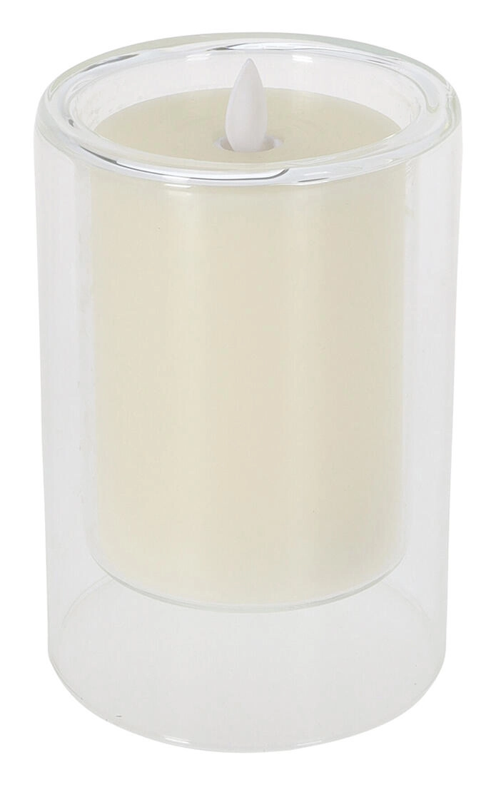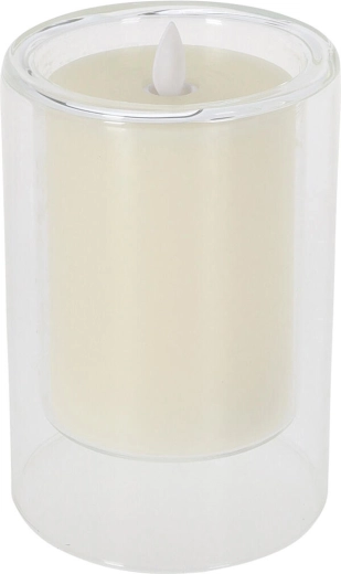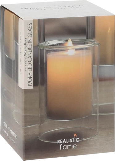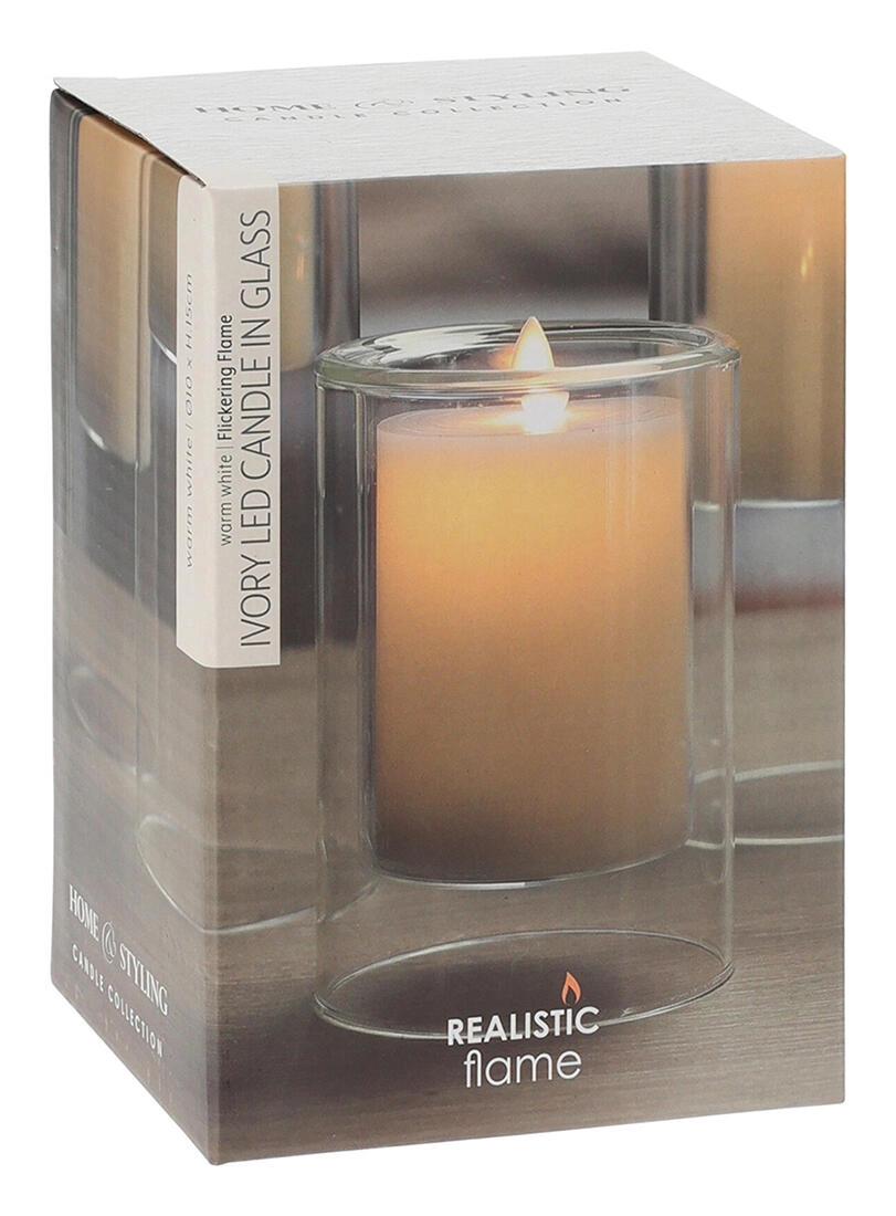 Deze stijlvolle LED-kaars met afmetingen van 10 × 15 cm is geplaatst in een heldere glazen behuizing die haar moderne uitstraling benadrukt. De zachte kleur Ivory past in elk interieur en is eenvoudig te combineren met andere decoraties.