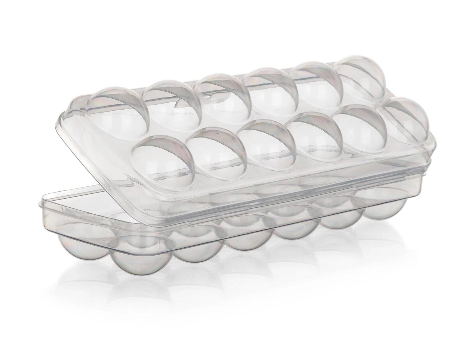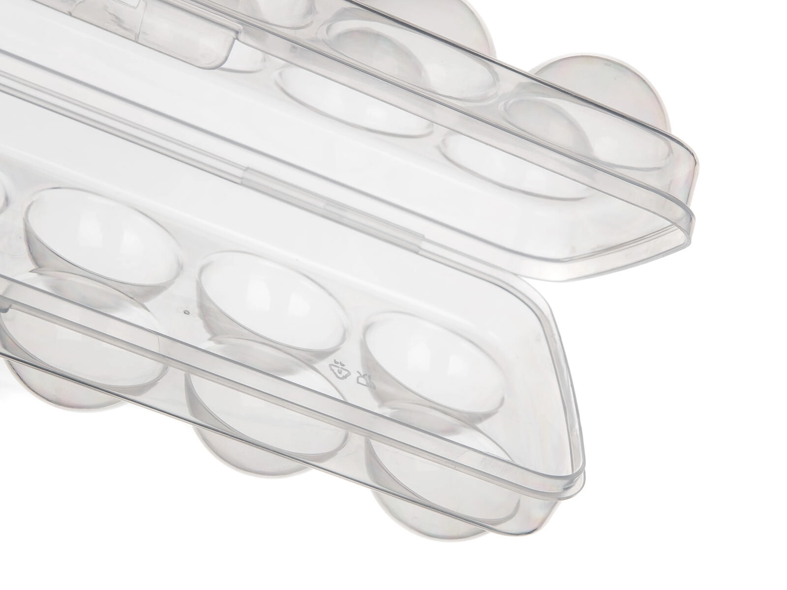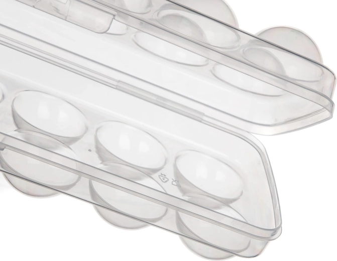 Ergonomisch gevormde uitsparingen voorkomen rollen en barsten van eieren. Het lage profiel en het vlakke deksel maken eenvoudig stapelen in de koelkast en in het deurvak mogelijk, waardoor je ruimte bespaart en orde houdt.