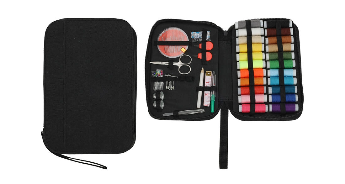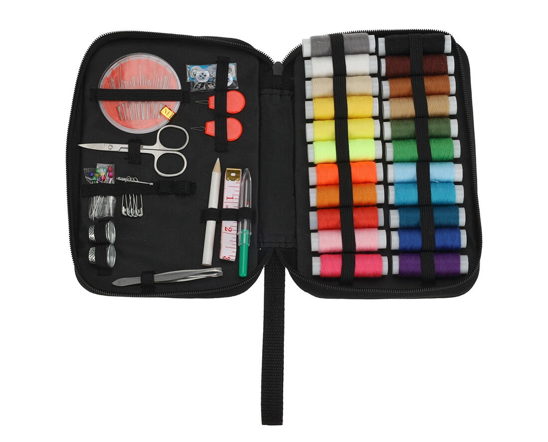 De set bevat een brede schakering aan garens, naalden, schaar, tornmesje, inrijger, kleermakersmeetlint, veiligheidsspelden en andere kleinigheden – klaar voor snelle reparaties.