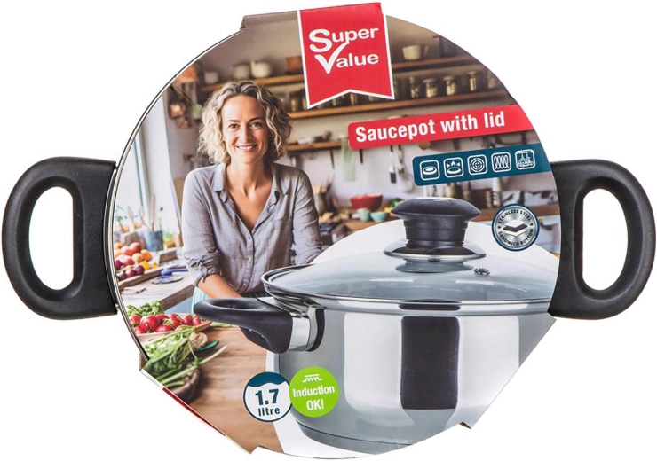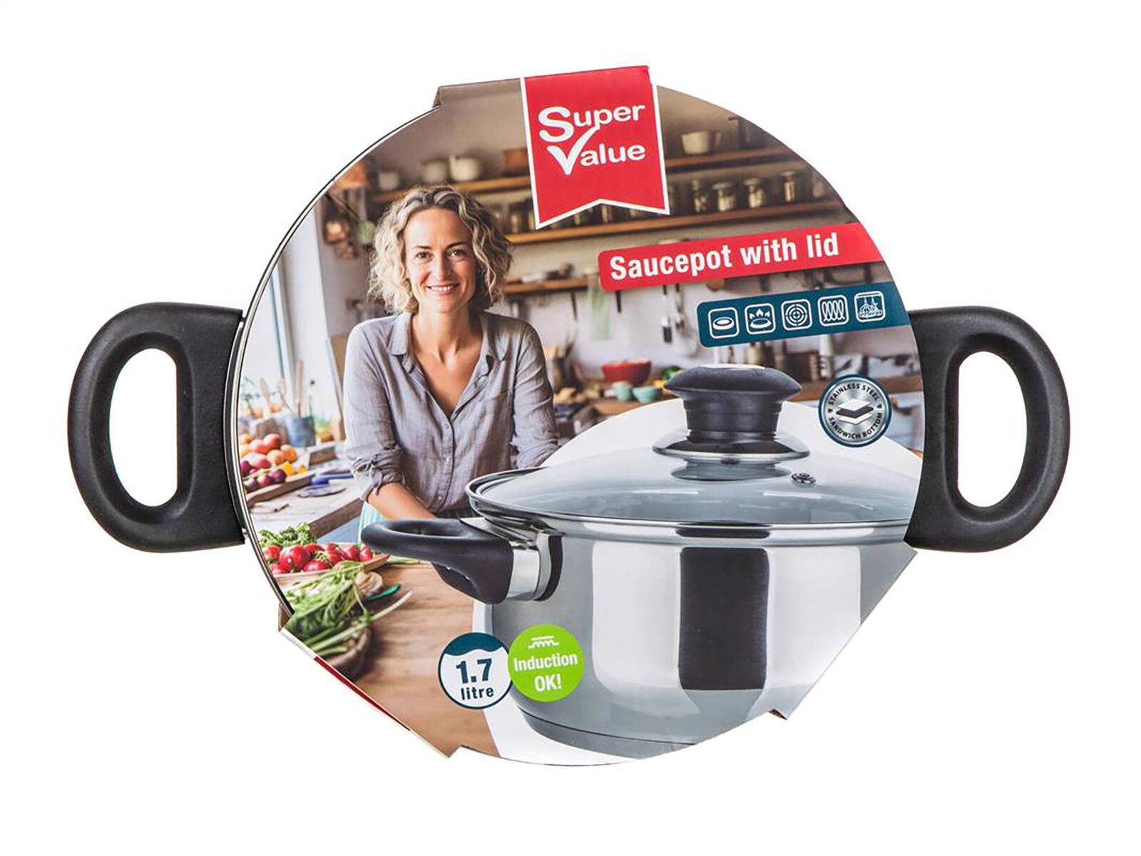 Praktische roestvrijstalen pan SUPER VALUE met een inhoud van 1,7 l en een diameter van 18 cm, ideaal voor dagelijks koken. Biedt gelijke warmteverdeling, een glazen deksel met stoomventiel voor kookcontrole en hittebestendige bakelieten handgrepen voor veilig hanteren. Geschikt voor alle soorten kookplaten, inclusief inductie en vaatwasserbestendig.