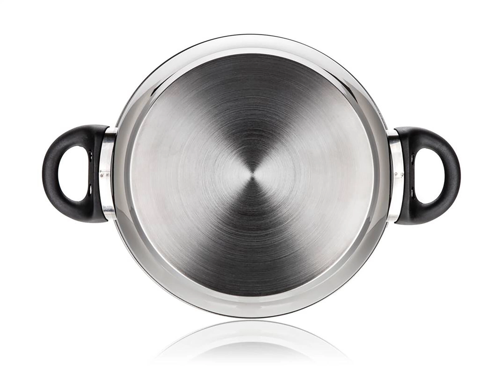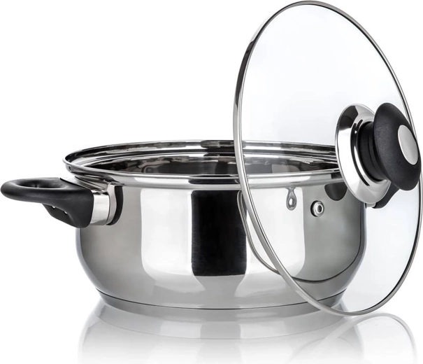 De roestvrijstalen pan met glazen deksel SUPER VALUE combineert duurzaamheid, eenvoudig onderhoud en een modern glanzend design. Dankzij de brede bodem en de hoogwaardige constructie wordt een stabiele warmtegeleiding bereikt, ideaal voor het koken van soepen, sauzen en bijgerechten. Het transparante deksel met stoomventiel laat je het kookproces controleren zonder onnodig op te tillen.