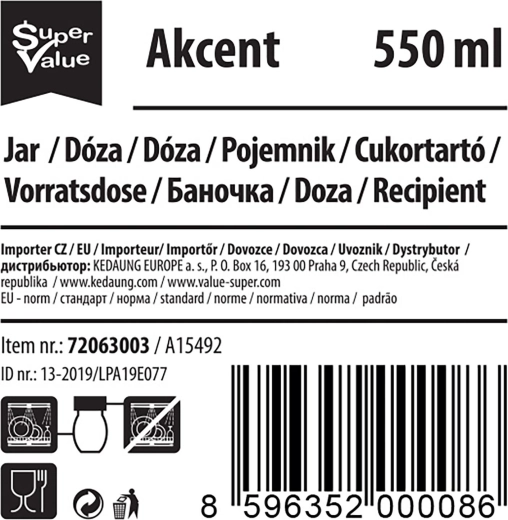 Praktische glazen pot AKCENT met een inhoud van 0,55 l en een elegant roestvrijstalen deksel, ideaal voor het dagelijks bewaren van voedingsmiddelen. Houdt de inhoud langer vers en zorgt voor een overzichtelijke keukenindeling. Geschikt voor kruiden, suiker, peulvruchten en pasta, met een duurzaam glazen lichaam en een hoogwaardig roestvrijstalen deksel.