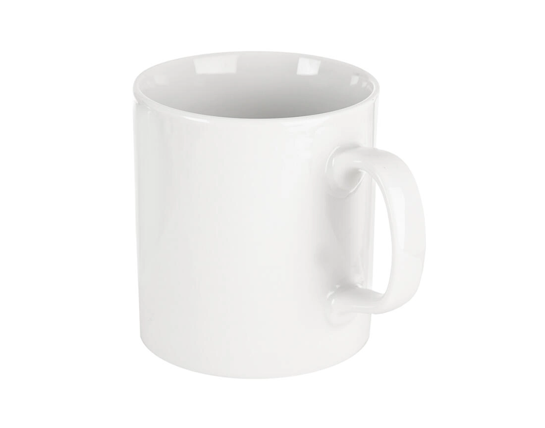 De effen witte beker zonder opdruk past in elke keuken en kan eenvoudig worden gepersonaliseerd met een print of sticker.