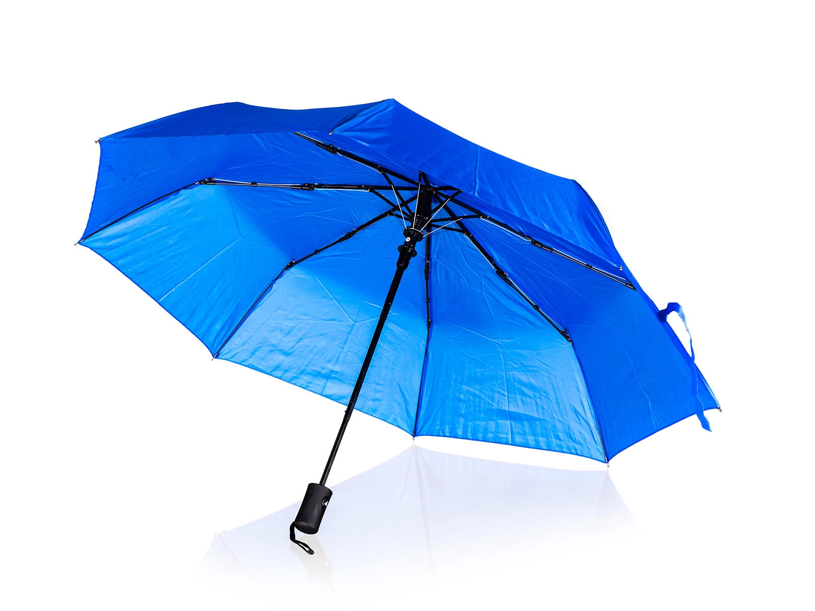De automatische opening zorgt voor comfortabel uitklappen met één druk op de knop, terwijl windbestendige elementen helpen schade aan de baleinen bij windstoten te voorkomen. Het elegante blauwe design past bij elke outfit en dankzij het polsbandje op het handvat is de paraplu gemakkelijk mee te nemen.