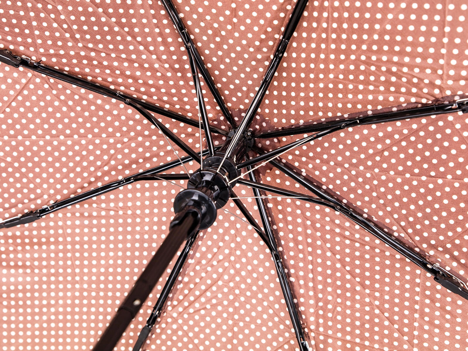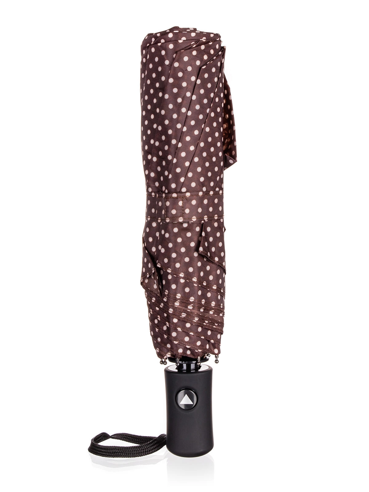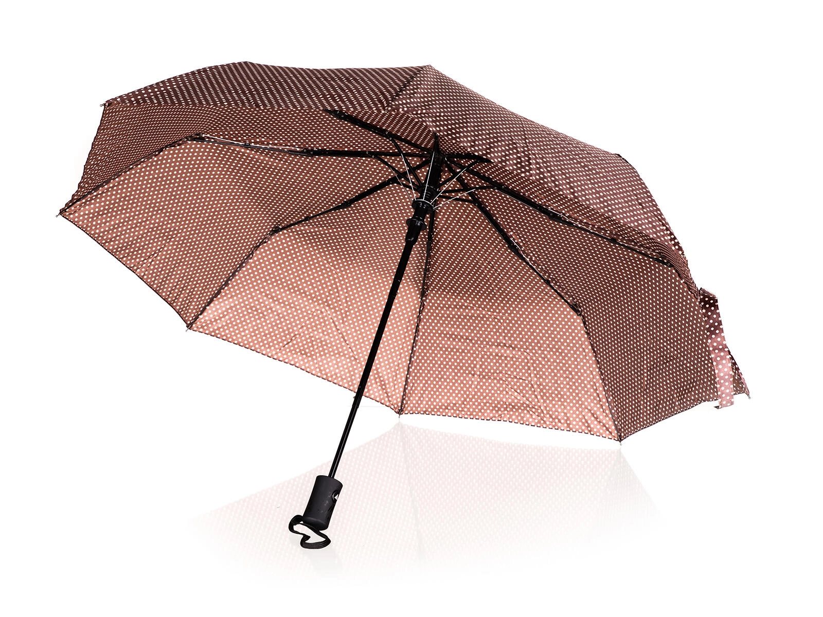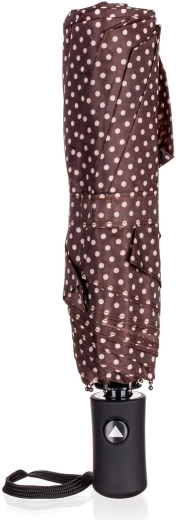 Een elegante en praktische metgezel voor ongunstig weer. Deze bruine opvouwbare paraplu met stippen combineert stijl en functionaliteit: hij is licht, compact en dankzij het automatische openen in een oogwenk klaar voor gebruik. Waterdicht polyester stoot water betrouwbaar af, terwijl de stevige constructie windvlagen weerstaat.