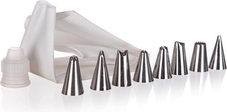 Praktische set voor banketbakkers en enthousiaste thuisbakkers: een decoratiezak met connector en 8 roestvrijstalen spuitmondjes voor nauwkeurige en creatieve decoraties van taarten, cupcakes en desserts. Eenvoudige bediening, duurzame uitvoering en veelzijdig te gebruiken voor crèmes, glazuren en vullingen.