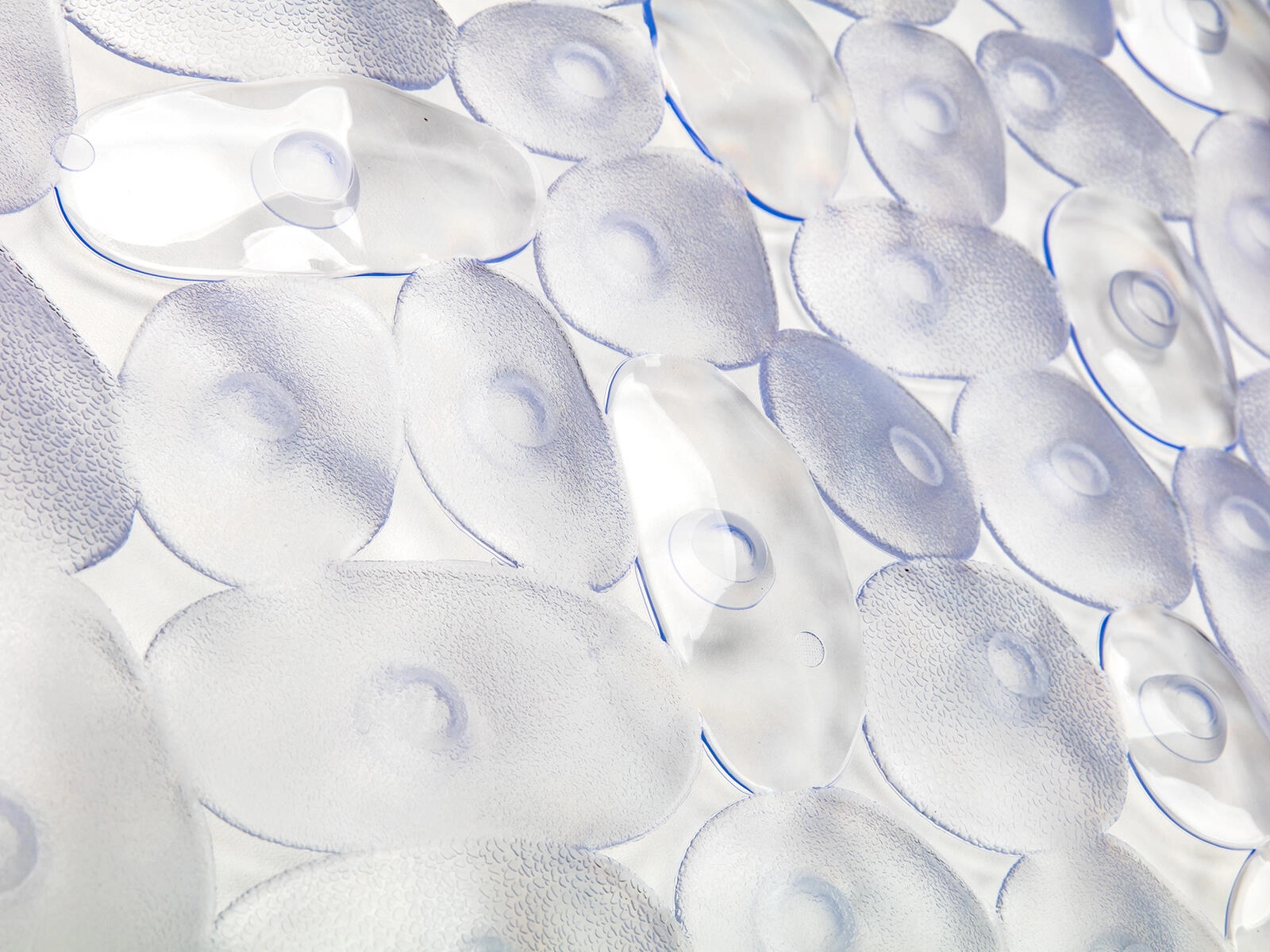 Honderden zuignappen aan de onderzijde houden de mat stevig op zijn plek en verminderen het risico op uitglijden op natte oppervlakken aanzienlijk.