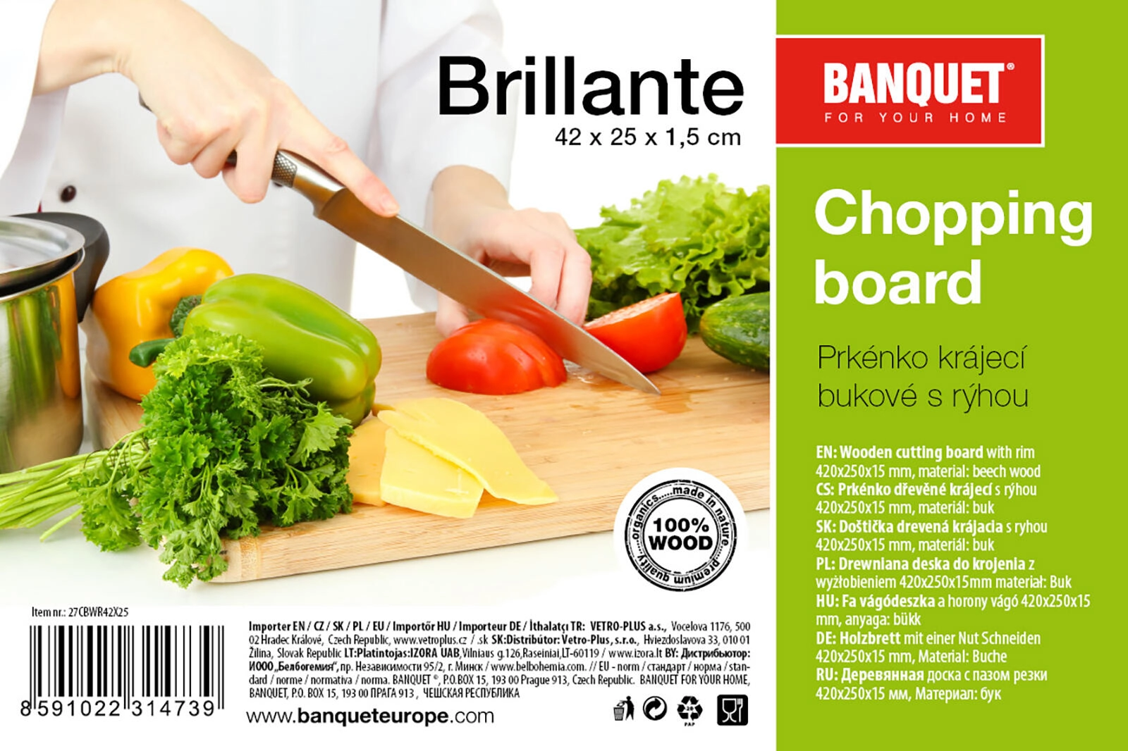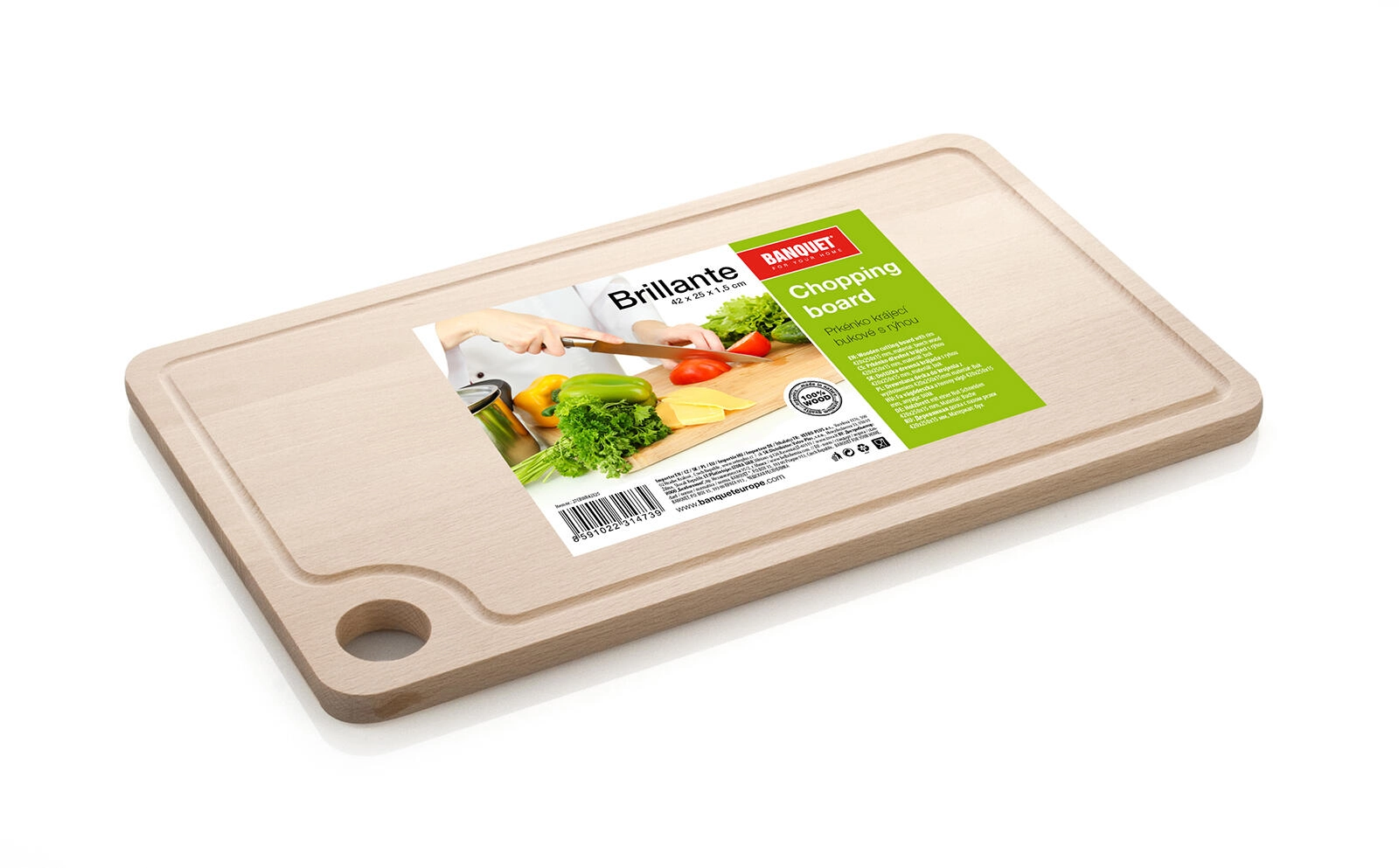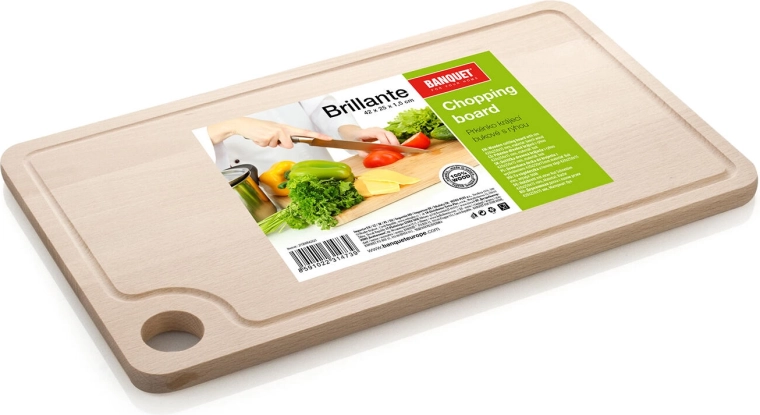 De BRILLANTE houten snijplank is gemaakt van duurzaam beukenhout in een naturel uitvoering. Dankzij de praktische geul rondom vangt hij vloeistoffen op en blijft het werkblad schoon. Het formaat 42 × 25 cm biedt ruim voldoende plek voor het comfortabel bereiden van vlees, groenten en brood.