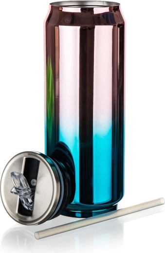 Het transparante deksel met drinktuit en het meegeleverde rietje maken veilig en comfortabel drinken mogelijk, ook onderweg. Het oppervlak in een aantrekkelijke regenboog goud‑roze‑blauwgroene uitvoering is niet alleen modern, maar ook duurzaam en eenvoudig te onderhouden.