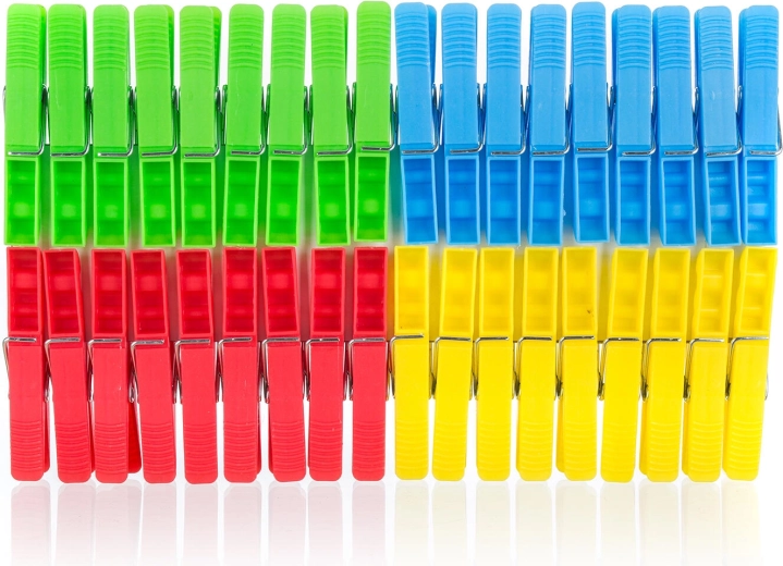 Praktische set van 36 plastic wasknijpers in een vrolijke mix van kleuren voor dagelijks gebruik. Dankzij de stevige stalen veer en anti‑slip ribbels blijven kledingstukken betrouwbaar op de lijn, zowel binnen als buiten. De ideale keuze voor voordelig en duurzaam drogen van de was.