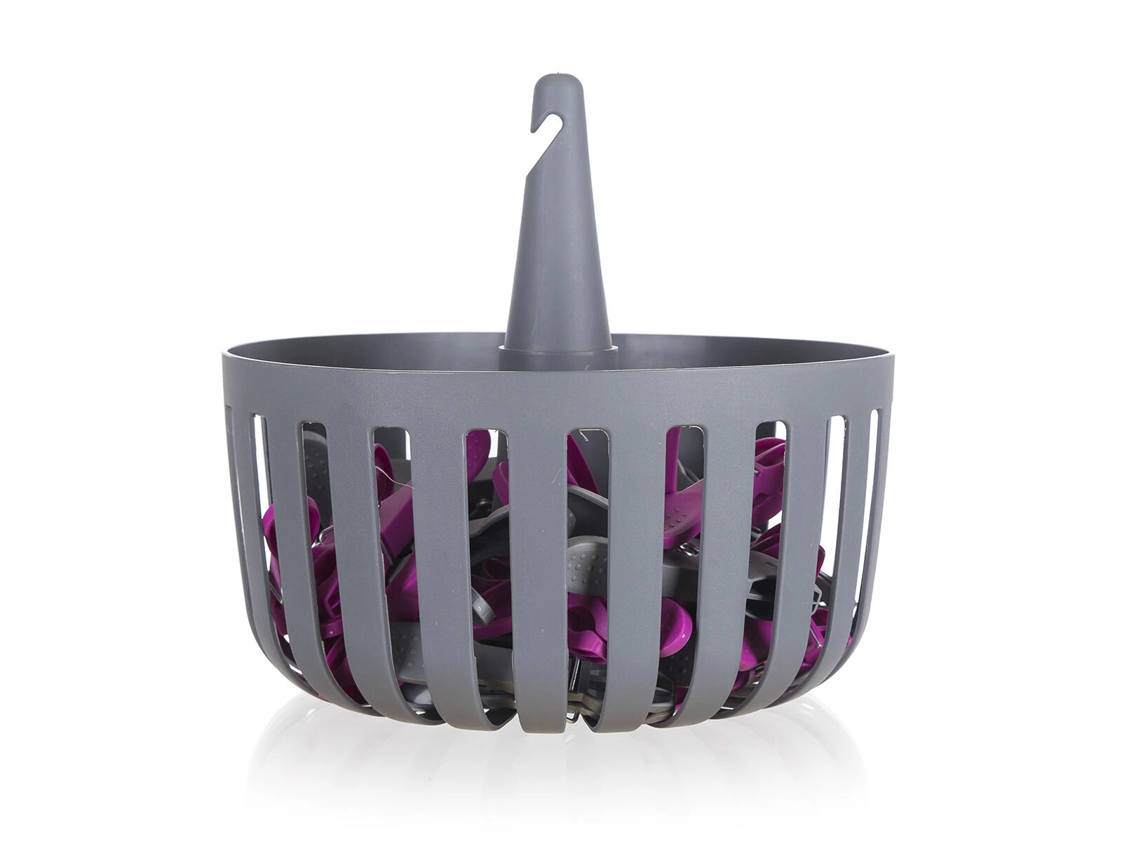 Verticale lamellen zorgen voor luchtcirculatie en snel drogen van de knijpers. De mand is licht, stevig en gemakkelijk te dragen.