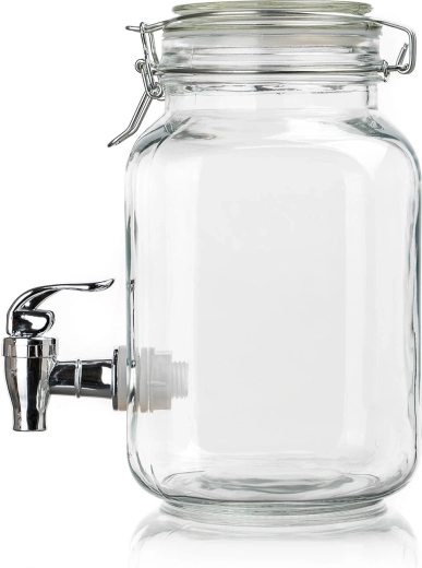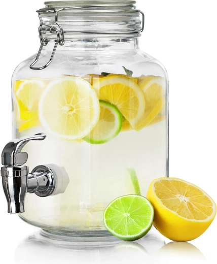 Stijlvolle glazen drankdispenser met een inhoud van 2,2 l, ideaal voor het serveren van huisgemaakte limonades, sappen en ijsthee. Dankzij het beugeldeksel met afdichting blijven dranken langer vers en zorgt de metalen kraan voor comfortabel en schoon schenken. De brede hals vergemakkelijkt het vullen en het toevoegen van ijs en stukjes fruit – perfect voor feestjes, tuinparty’s en dagelijkse verfrissing.