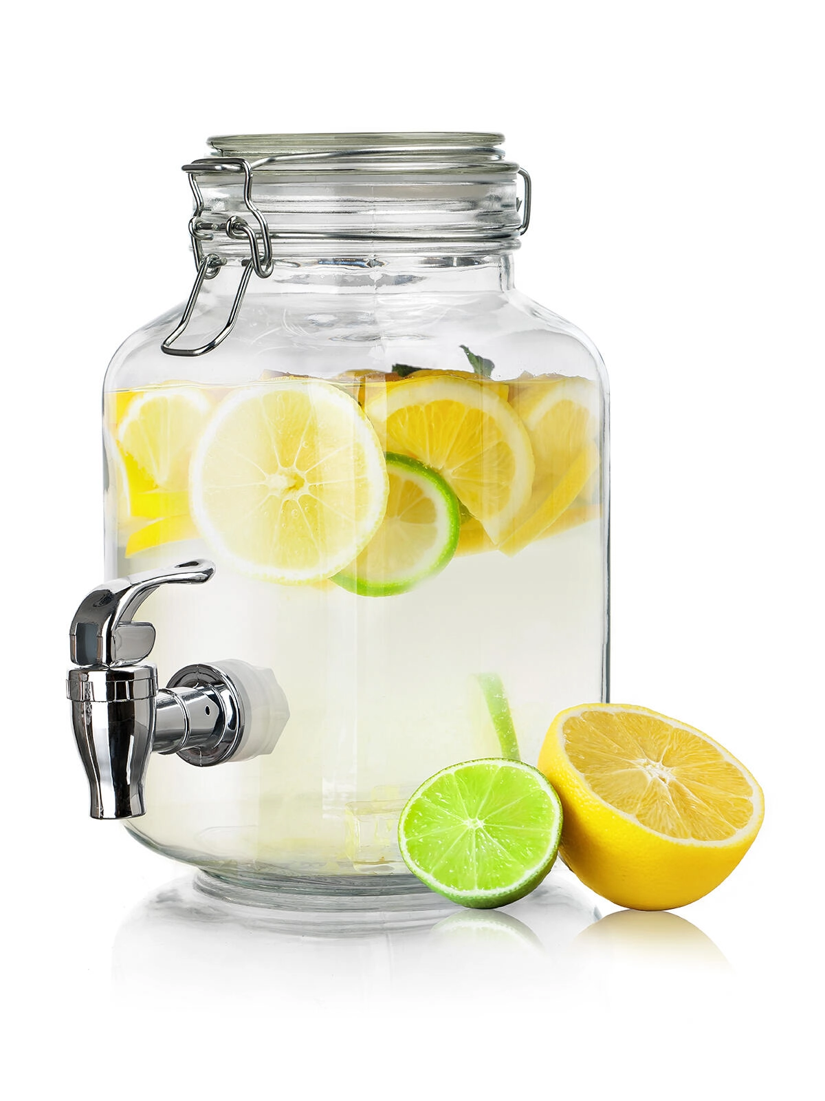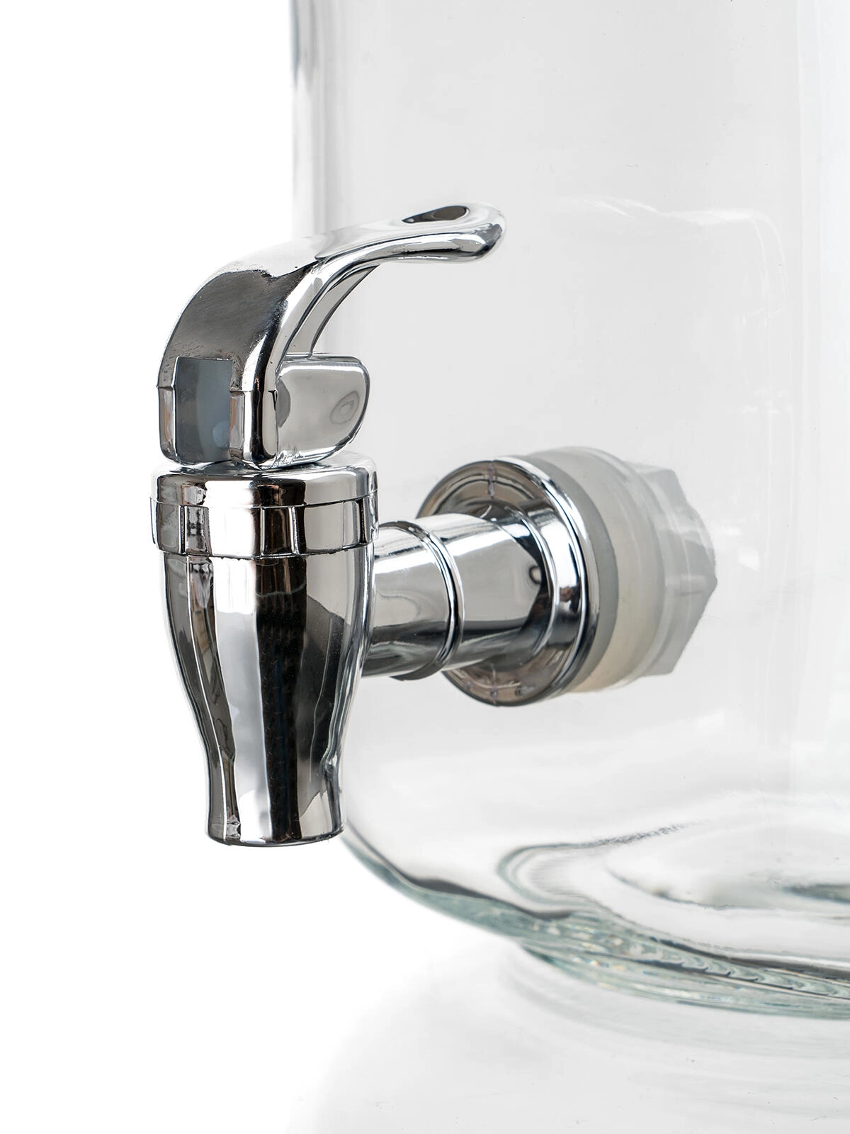 Deze veelzijdige glazen dispenser biedt een elegante manier om koude dranken te serveren bij familiebijeenkomsten en grotere evenementen. Het transparante heldere glas accentueert prachtig de kleuren van drank, fruit en kruiden, en maakt het eenvoudig om de resterende hoeveelheid te controleren.