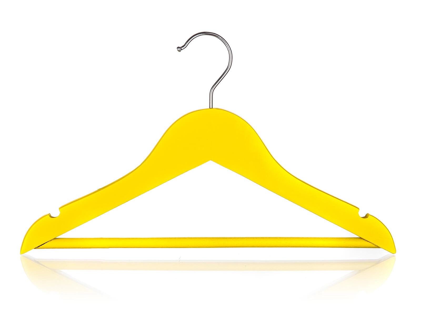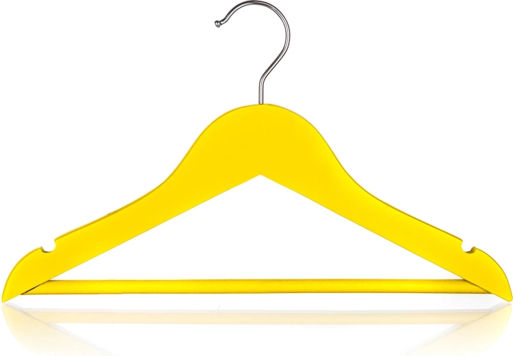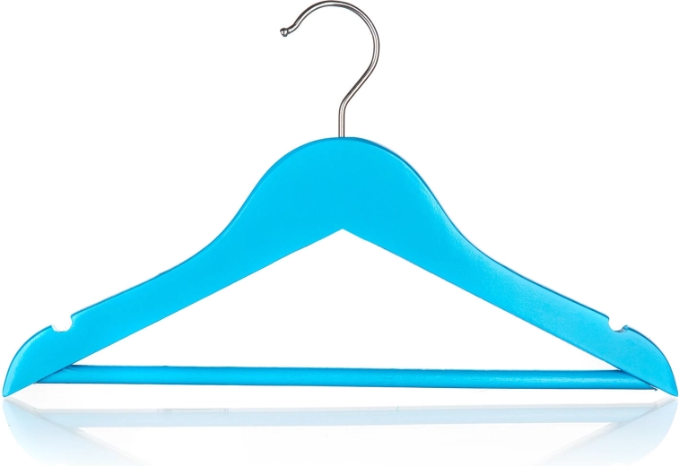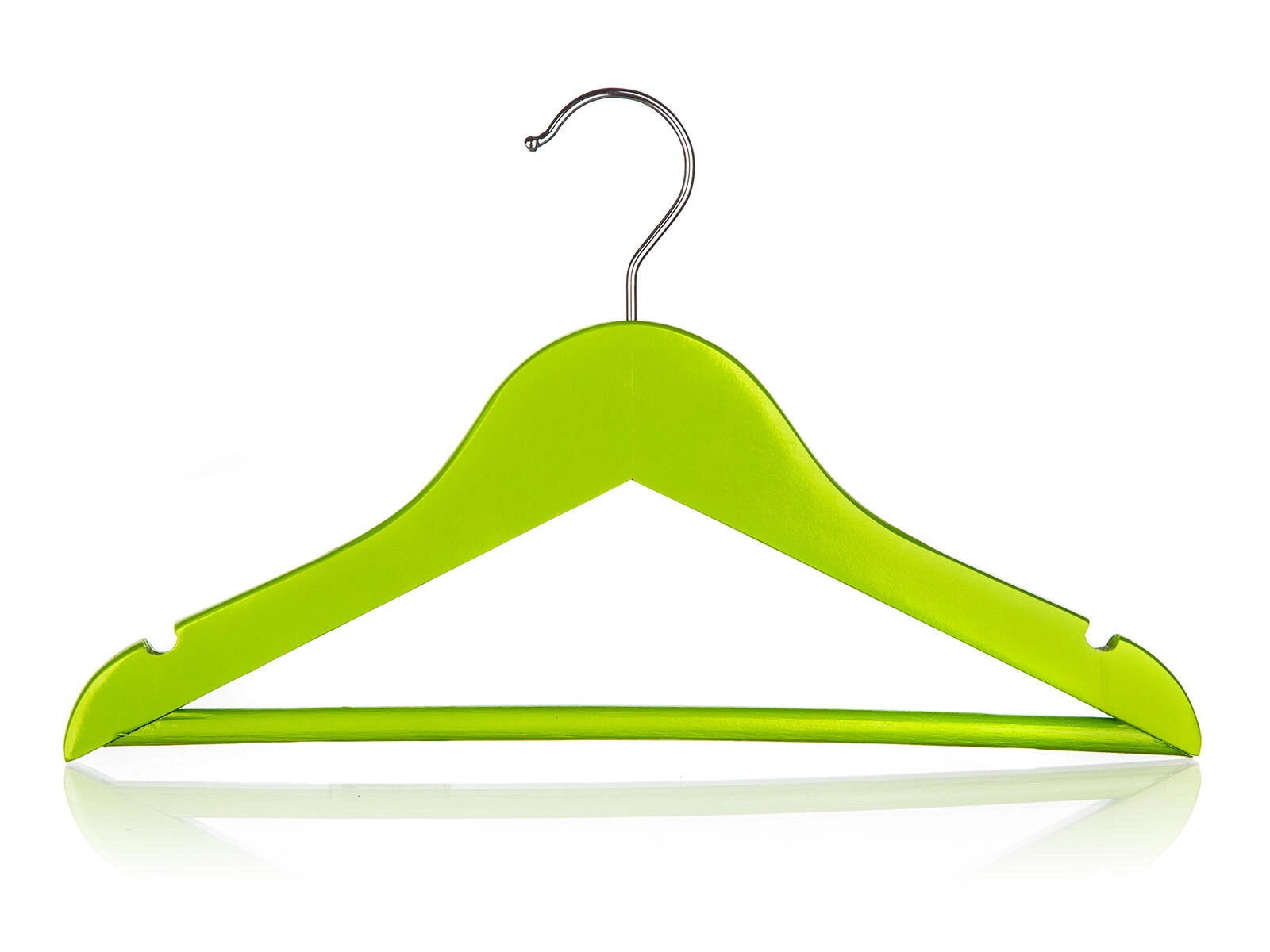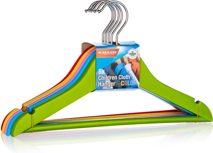 Dankzij de praktische inkepingen blijven ook kledingstukken met bandjes goed hangen, de gladde lak beschermt stoffen tegen haken en de metalen haak zorgt voor eenvoudig gebruik aan de kledingroede. De mix van kleuren (geel, roze, rood, blauw, groen) fleurt de kinderkast op en maakt het sorteren op kleur gemakkelijker.