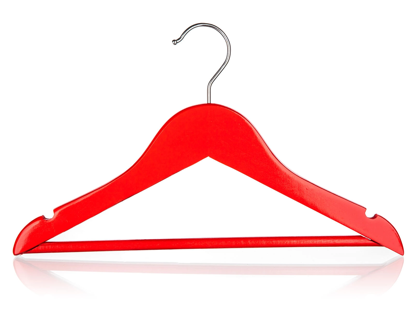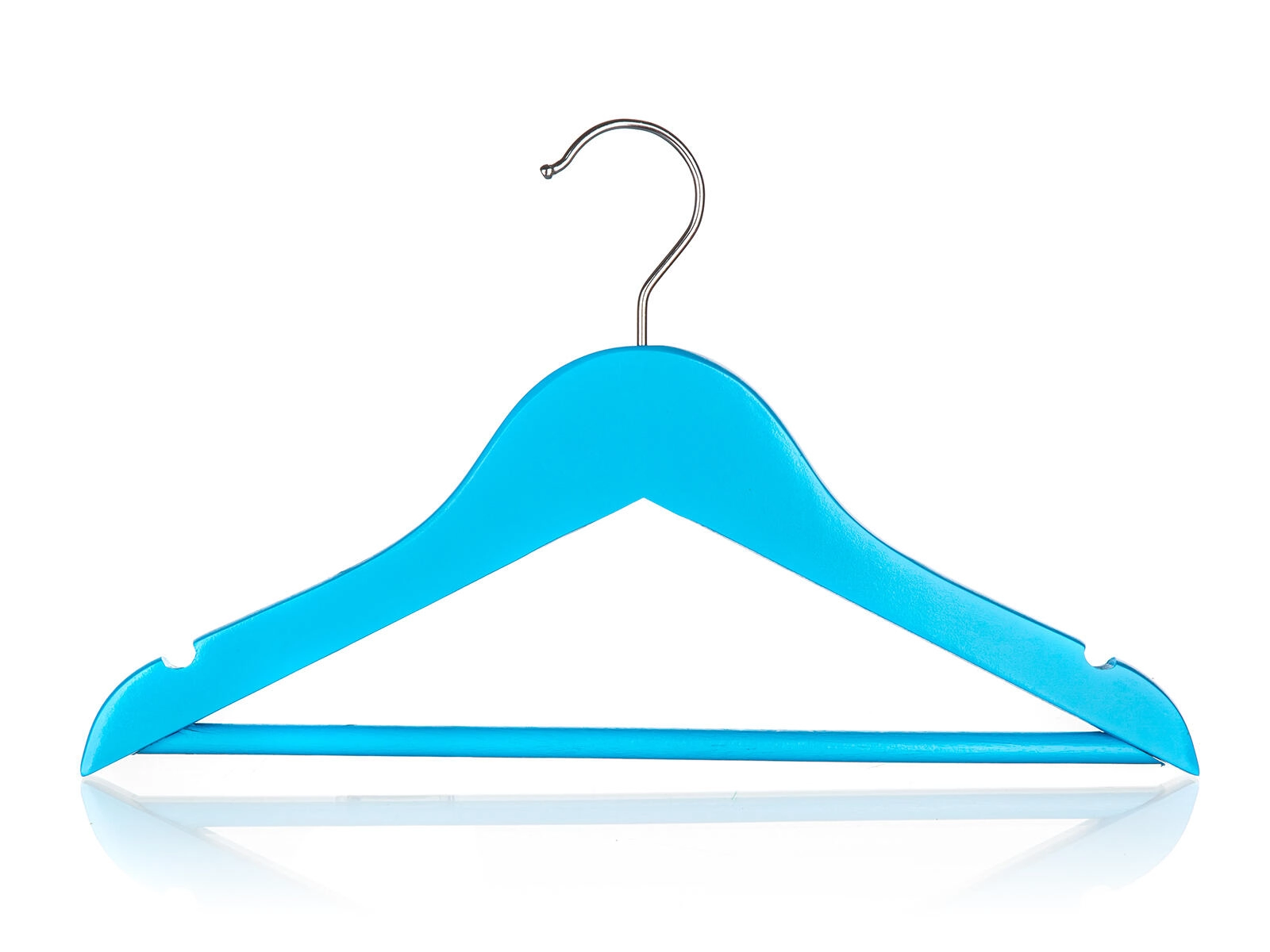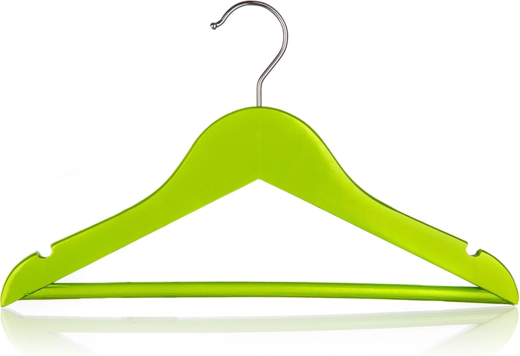 Dankzij de praktische inkepingen blijven ook kledingstukken met bandjes goed hangen, de gladde lak beschermt stoffen tegen haken en de metalen haak zorgt voor eenvoudig gebruik aan de kledingroede. De mix van kleuren (geel, roze, rood, blauw, groen) fleurt de kinderkast op en maakt het sorteren op kleur gemakkelijker.