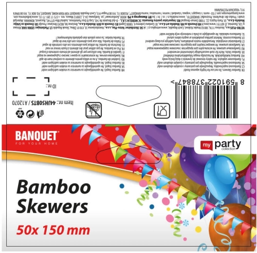 Praktische bamboe spiesen BANQUET van 15 cm met platte greep, ideaal voor het serveren van hapjes, het grillen van spiesen en stijlvolle party-sneden. Dankzij het natuurlijke materiaal zijn ze licht, stevig en wegwerp, met een scherpe punt voor gemakkelijk prikken en een paddle-greep voor comfortabel vasthouden.