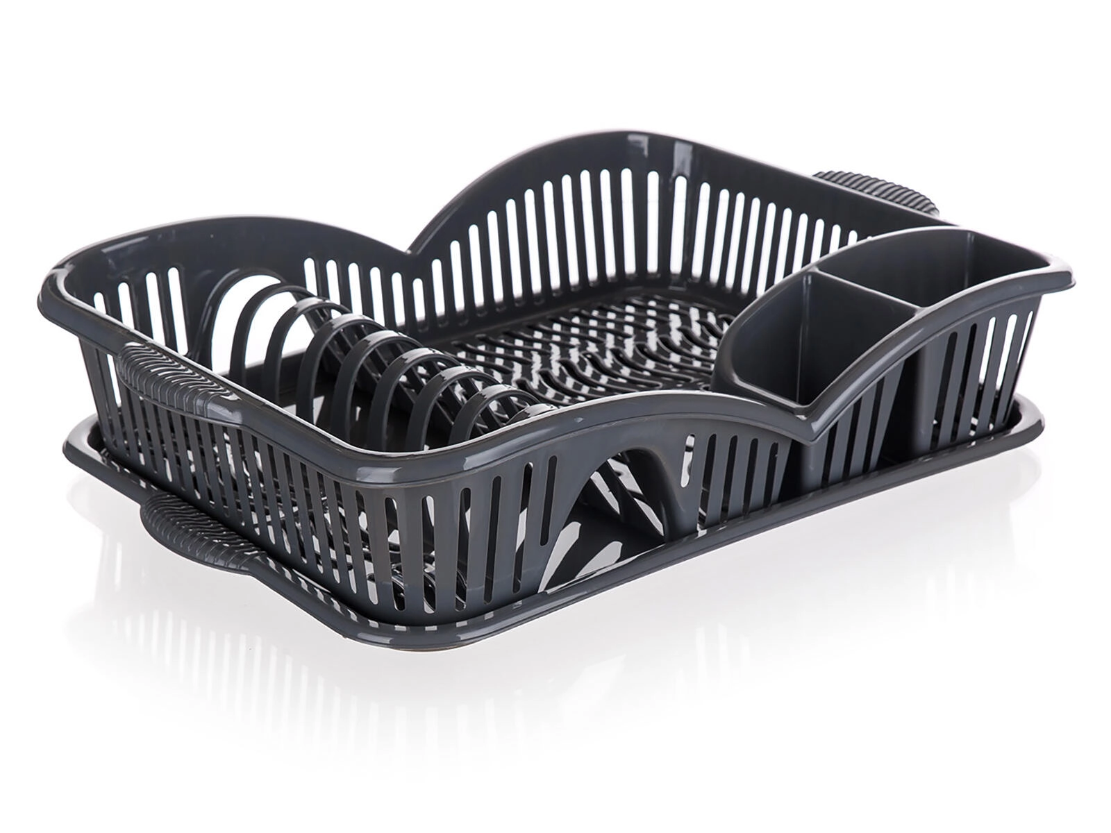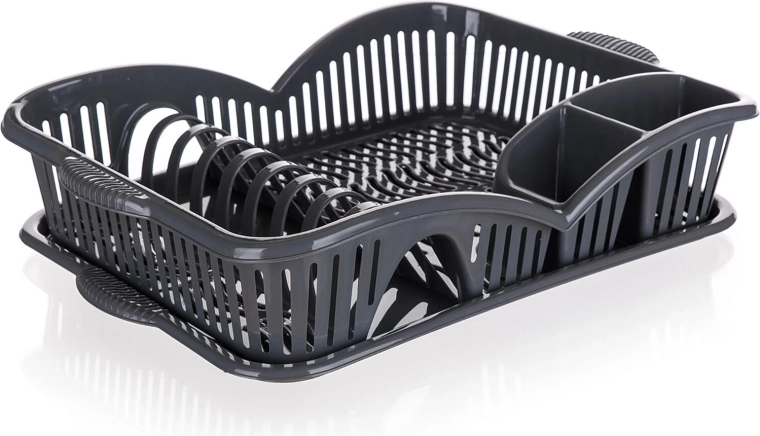 Het praktische myKitchen afdruiprek in elegant antraciet bespaart tijd en ruimte op het aanrecht. Het biedt 3 overzichtelijke secties voor bestek, borden en ander servies, heeft een lekbak voor het opvangen van water en is gemaakt van duurzaam kunststof voor eenvoudig onderhoud.