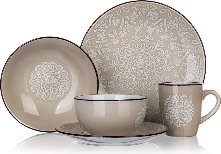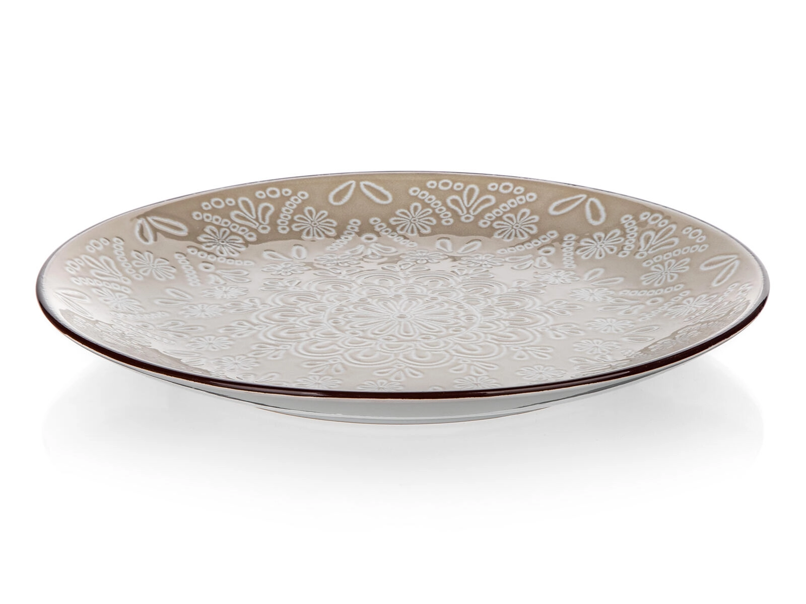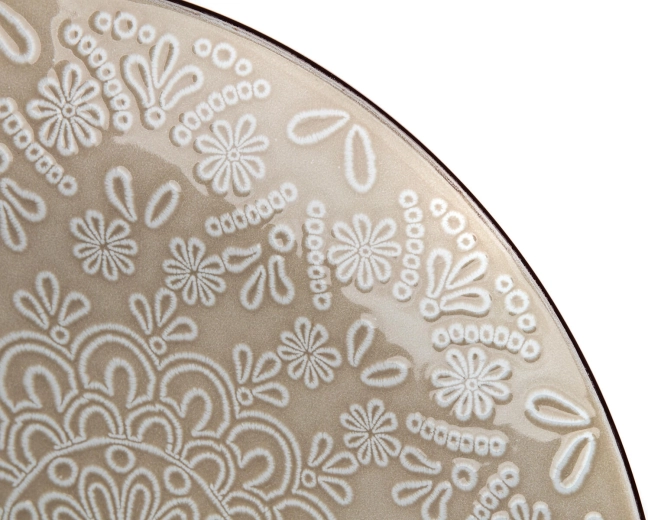 Elegant ondiep bord met een diameter van 27 cm in crèmekleur met een stijlvol kantdecor dat uw tafel een bijzondere charme geeft. Dankzij de hoogwaardige keramiek is het stevig, duurzaam en eenvoudig te onderhouden. Geschikt voor de vaatwasser en magnetron, ideaal voor dagelijks gebruik en feestelijk serveren.