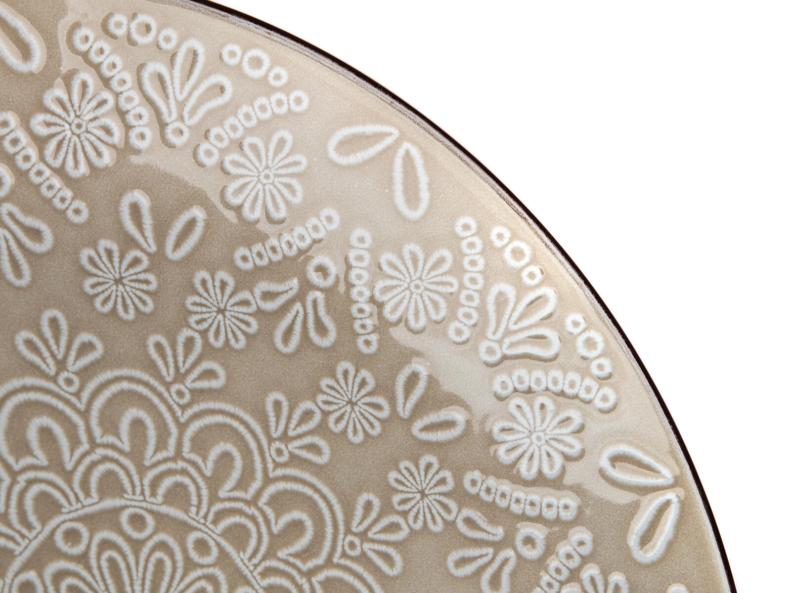 Het reliëf kantmotief met een donkerdere rand geeft het bord een uniek karakter en maakt van elke presentatie een esthetische belevenis.