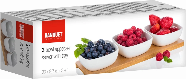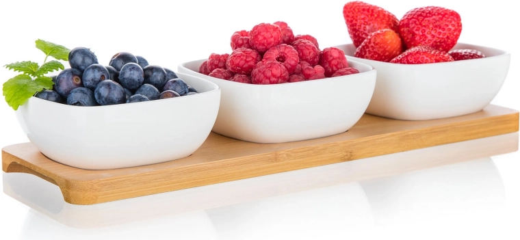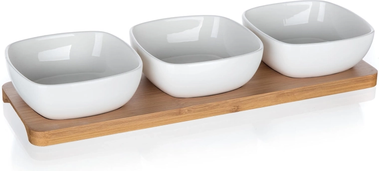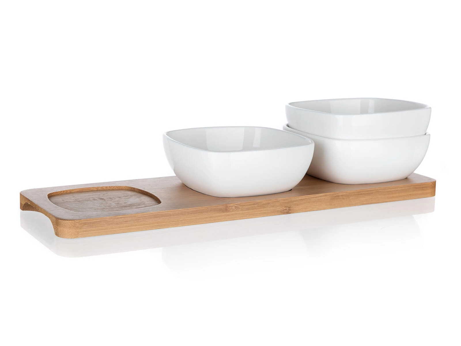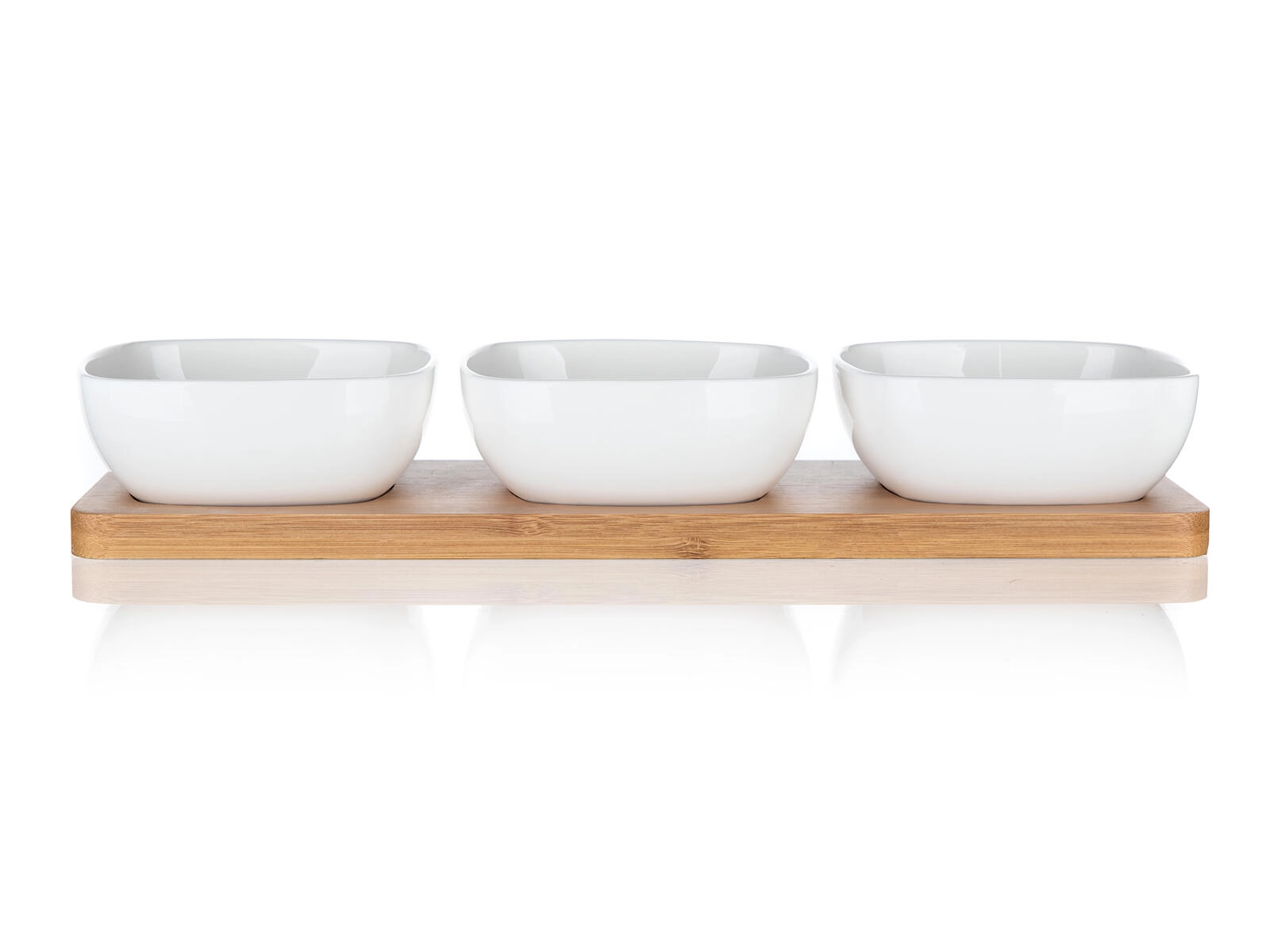 Deze compacte set van drie vierkante schaaltjes van hoogwaardig porselein op een stevige bamboe onderplaat biedt een praktische en esthetische oplossing voor dagelijks serveren én feestelijke gelegenheden. Glanzend porselein accentueert de kleuren van de geserveerde lekkernijen en natuurlijk bamboe voegt een warme, moderne toets toe.