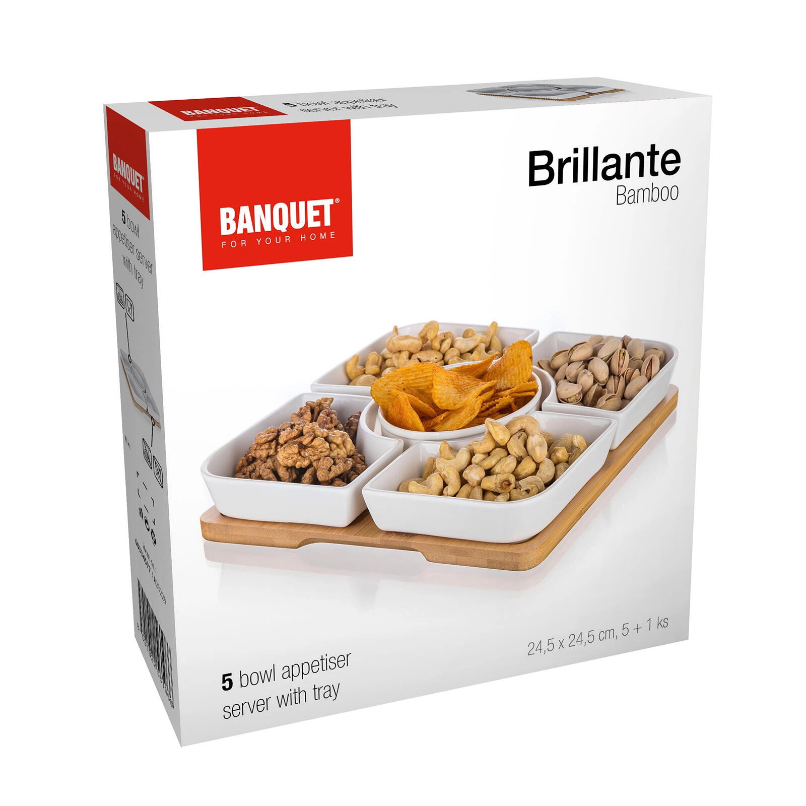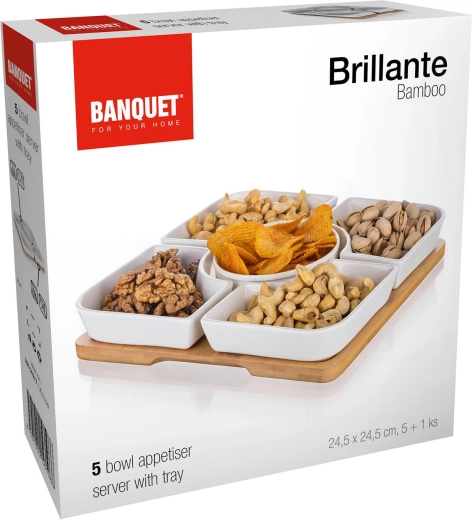 De elegante BRILLANTE serveerset combineert hoogwaardig porselein en natuurlijk bamboe voor stijlvol serveren van hapjes. De zeskelige set met vijf schaaltjes en een dienblad met afmetingen van 24,5 × 24,5 × 4,5 cm is perfect voor noten, olijven, gedroogd fruit of dip-sauzen. Makkelijk te dragen, te onderhouden en zorgt voor overzichtelijk, geordend serveren bij elke gelegenheid.
