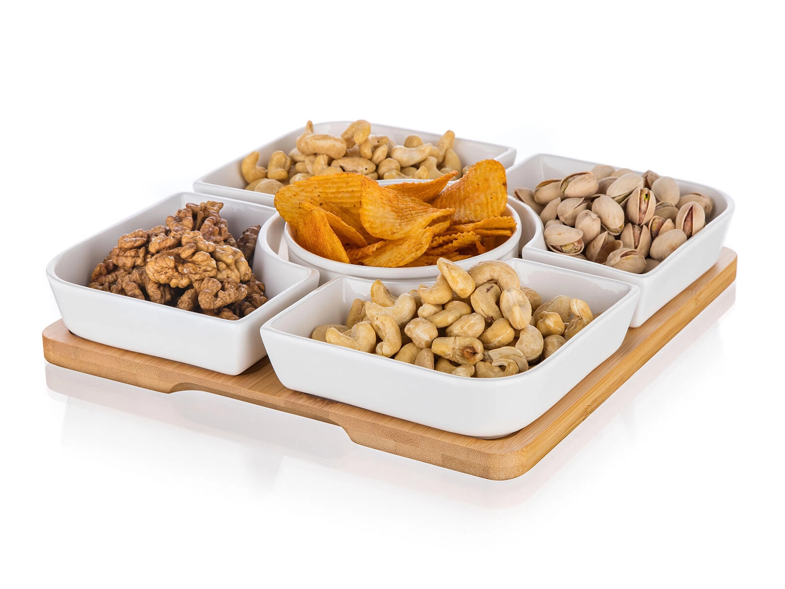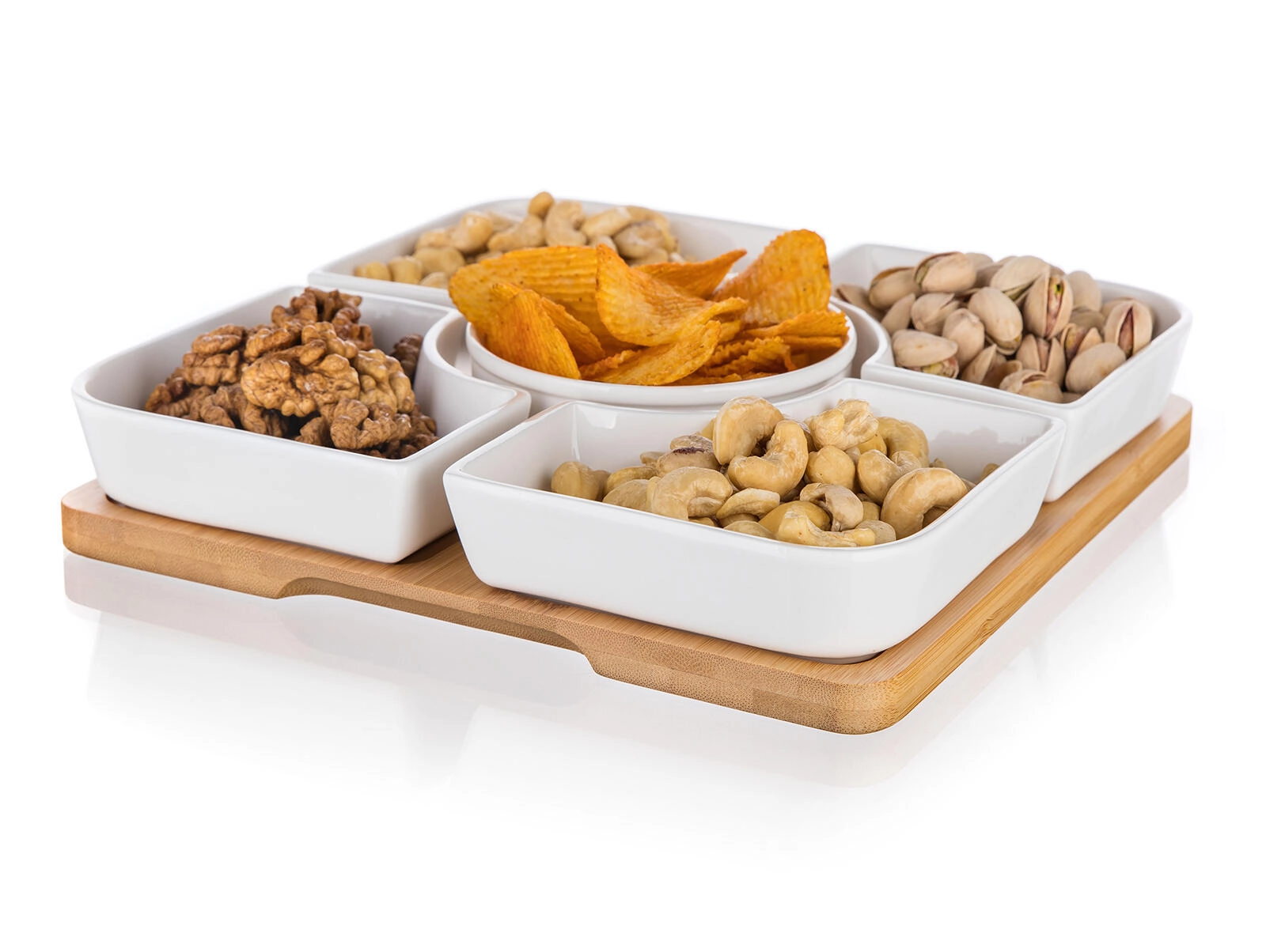 Vier vierkante schaaltjes en een centraal rond schaaltje op een bamboe dienblad zorgen voor een overzichtelijke indeling van snacks en een aantrekkelijke presentatie op tafel.