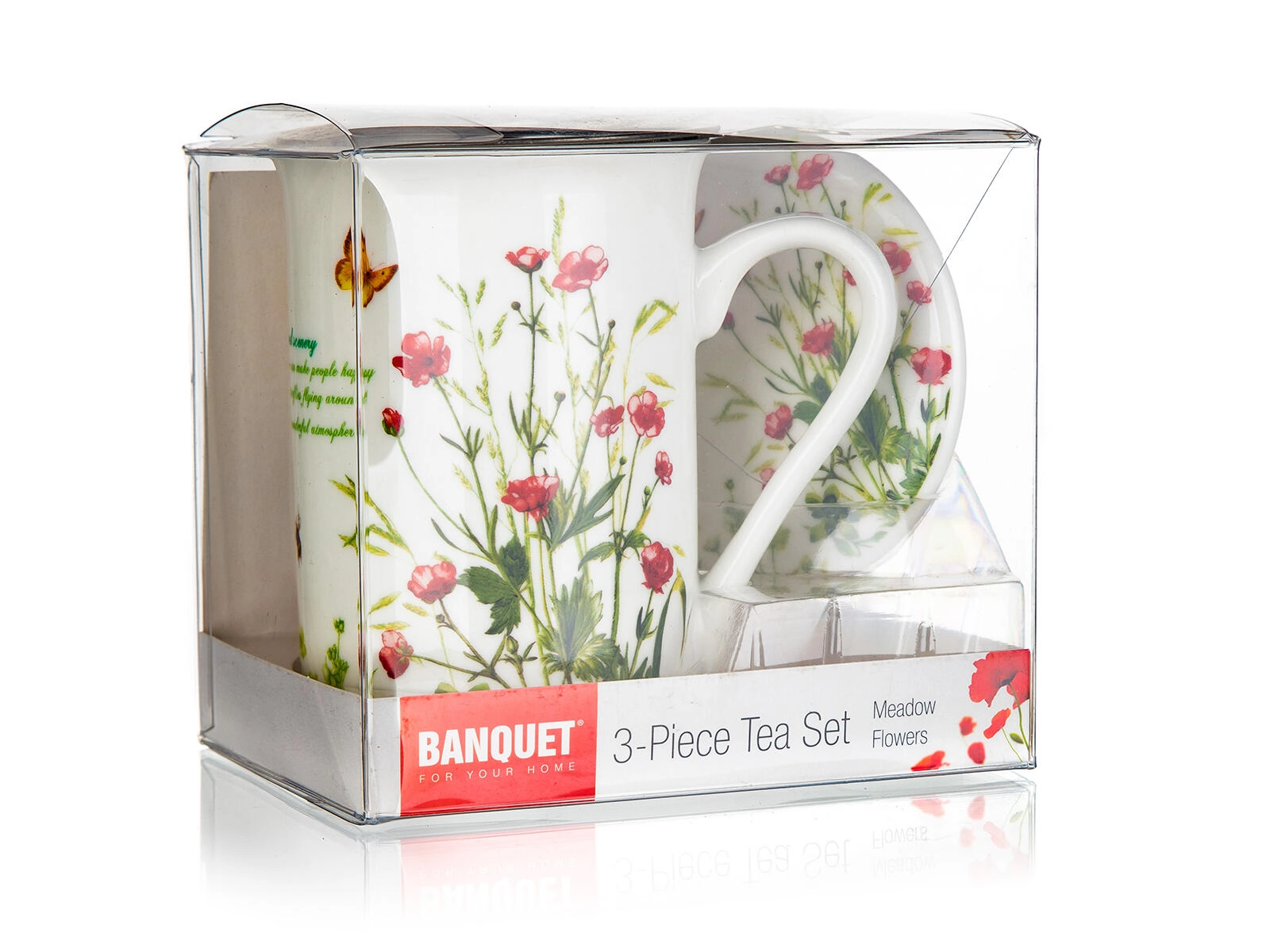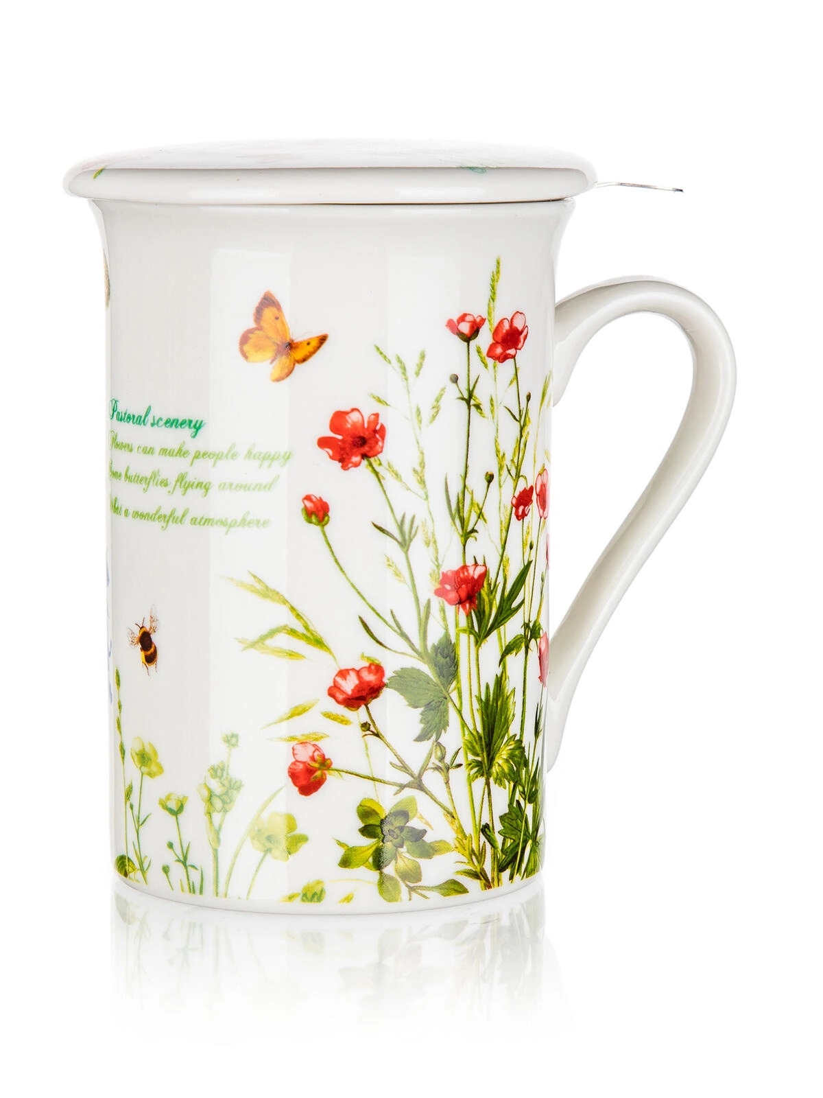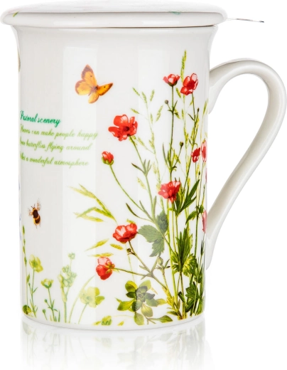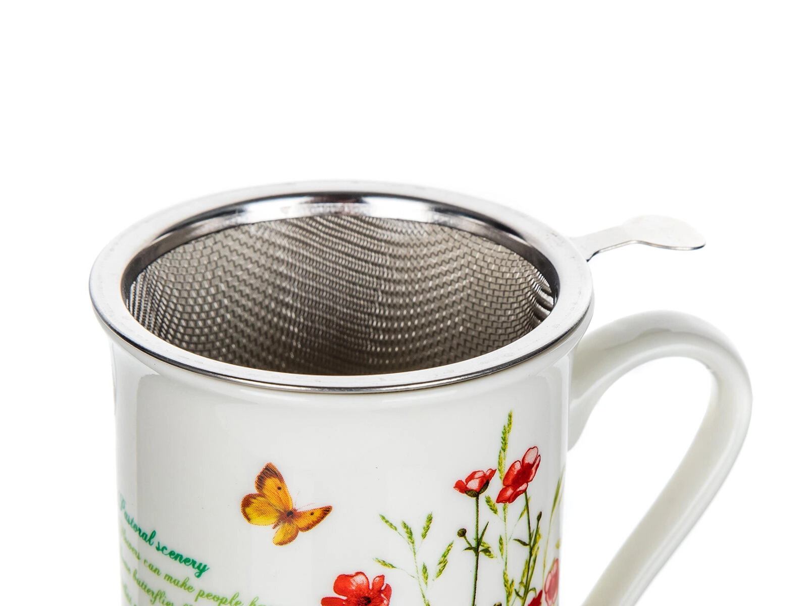 De stijlvolle mok MEADOW FLOWERS combineert charme en functionaliteit. Dankzij de roestvrijstalen zeef met fijne mesh bereid je je favoriete losse thee direct in de mok, terwijl het keramische deksel je drankje langer warm houdt. Na het trekken dient het deksel als praktische onderzetter voor de zeef.