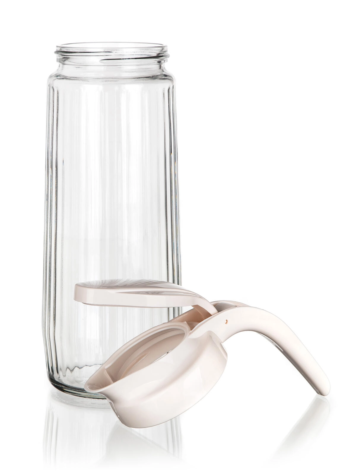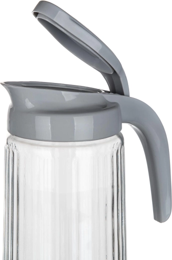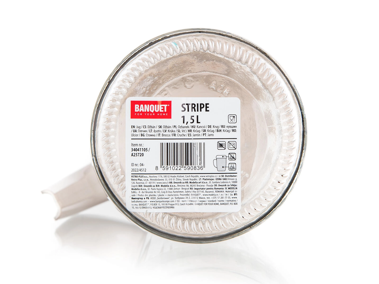 De glazen kan Stripe 1,5 l is ideaal voor water, limonades, iced tea en huisgemaakte sappen. Het geribde body (ribbed) geeft een moderne look en zorgt tegelijk voor een zekerdere grip. Het praktische kunststof deksel met opklapbare tuit maakt precies schenken eenvoudig en beschermt de drank tegen vuil.