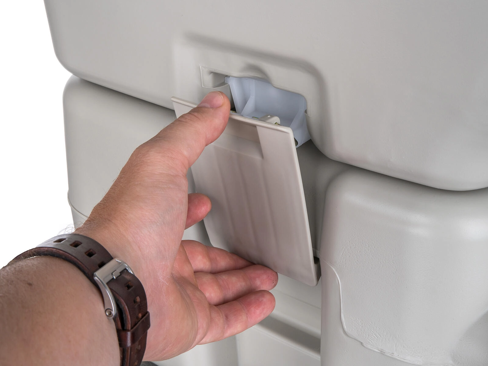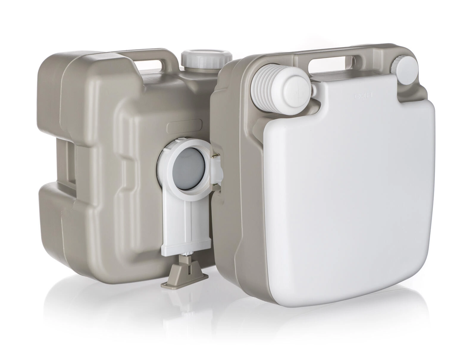 De afvaltank van 20 l en de aparte 14 l schoonwatertank bieden voldoende capaciteit voor meerdaags gebruik. Het duurzame HDPE-materiaal is ontworpen voor een lange levensduur onder veeleisende omstandigheden, terwijl de nieuwe verstevigde bodemconstructie het risico op schade bij frequent transport vermindert. Een trechter voor het eenvoudig bijvullen van chemische middelen is inbegrepen.