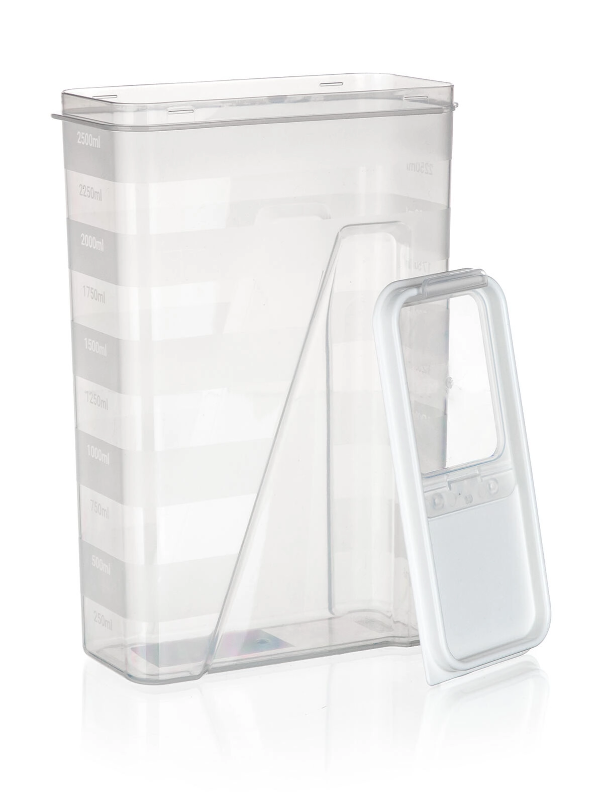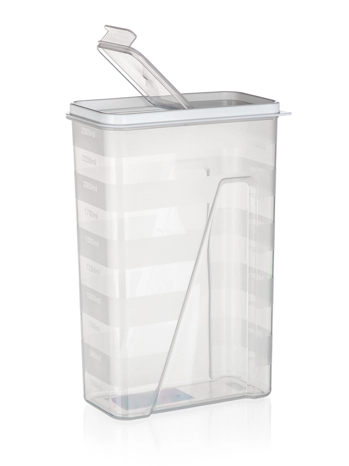 Praktische keukendoos met een inhoud van 2,5 l en een openklapbaar doseerdeksel voor eenvoudig strooien en nauwkeurig afmeten. Het transparante body maakt directe controle van de inhoud mogelijk en het afdichtende deksel in het wit helpt voedsel langer vers te houden. Ideaal voor pasta, peulvruchten, bloem, rijst of ontbijtgranen, met een maatverdeling per 250 ml voor comfortabel portioneren.