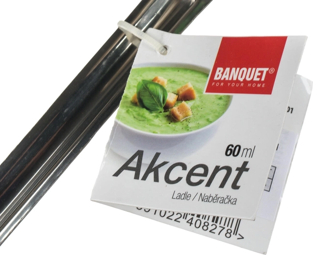 Praktische roestvrijstalen opscheplepel AKCENT met een inhoud van 60 ml en een diameter van 6,5 cm vergemakkelijkt het serveren van sauzen en vloeibare gerechten. Voorzien van een haak om op te hangen, vaatwasserbestendig en dankzij de stevige wanddikte van 1 mm geschikt voor dagelijks gebruik.
