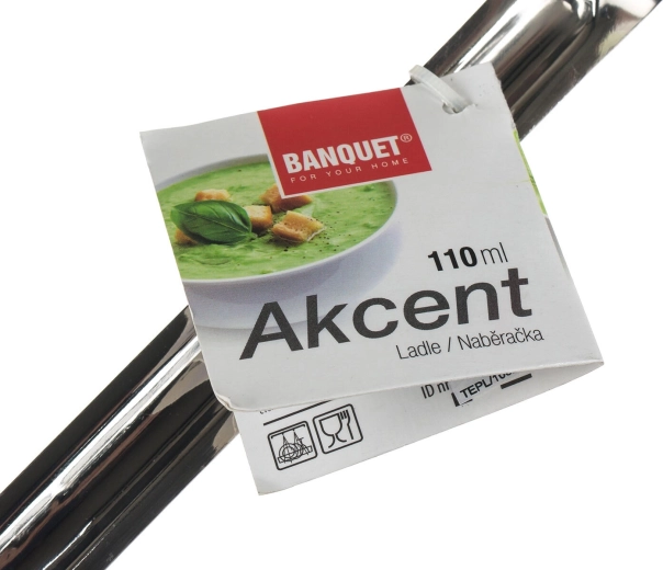 Praktische roestvrijstalen soeplepel AKCENT met een inhoud van 110 ml en een diameter van 8 cm, ideaal voor het serveren van sauzen en soepen. Dankzij de haak om op te hangen hang je hem eenvoudig aan een rail of de rand van de pan, en de vaatwasser bespaart je tijd bij het onderhoud.