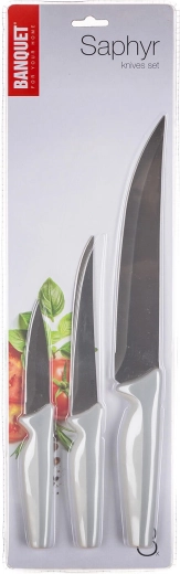 Praktische set keukenmessen SAPHYR in een 3-delige uitvoering dekt dagelijks snijden, portioneren en de voorbereiding van vlees. De hoogwaardige stalen lemmeten zorgen voor een lange levensduur en een precieze, schone snede, terwijl de ergonomische grijze handgrepen een zekere en comfortabele grip bieden.