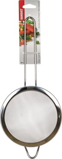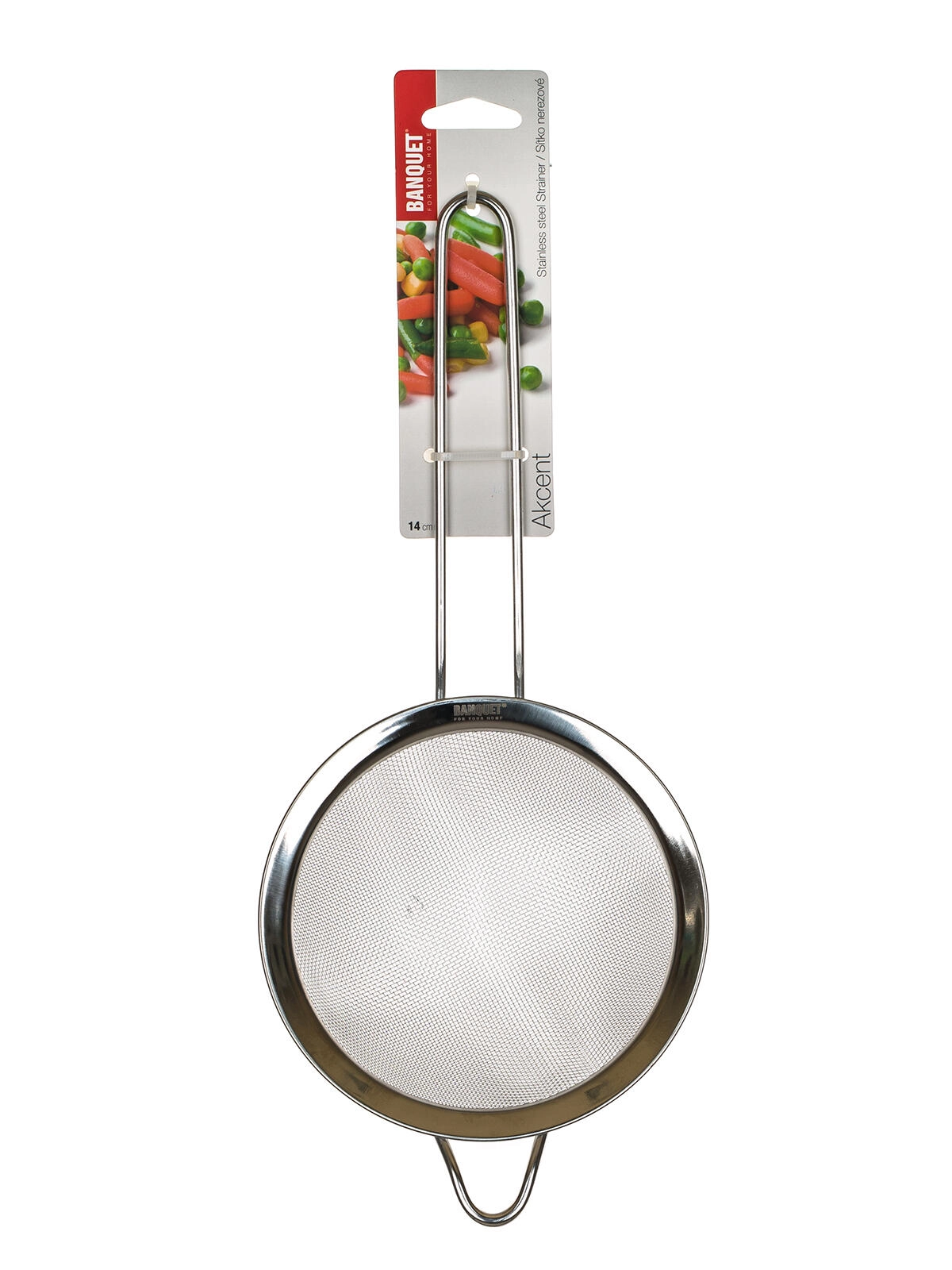 Praktische AKCENT keukenzeef met een diameter van 14 cm, ideaal voor het afgieten van vloeistoffen, het afspoelen van ingrediënten en fijne filtratie. Duurzame roestvrijstalen uitvoering, comfortabel metalen handvat met ophangoog en fijn gaas van 0,28 mm met een dichtheid van 20 mazen/cm² zorgen voor een schoon en snel resultaat bij het dagelijks koken.