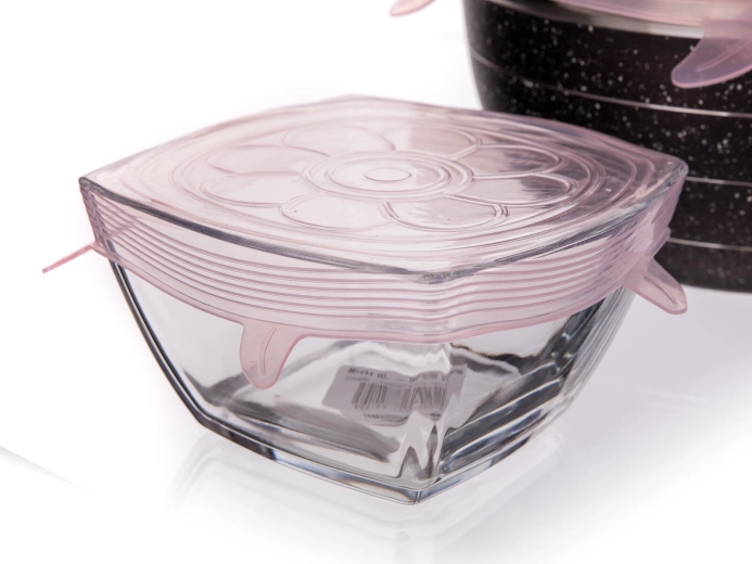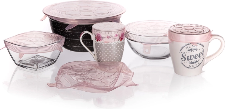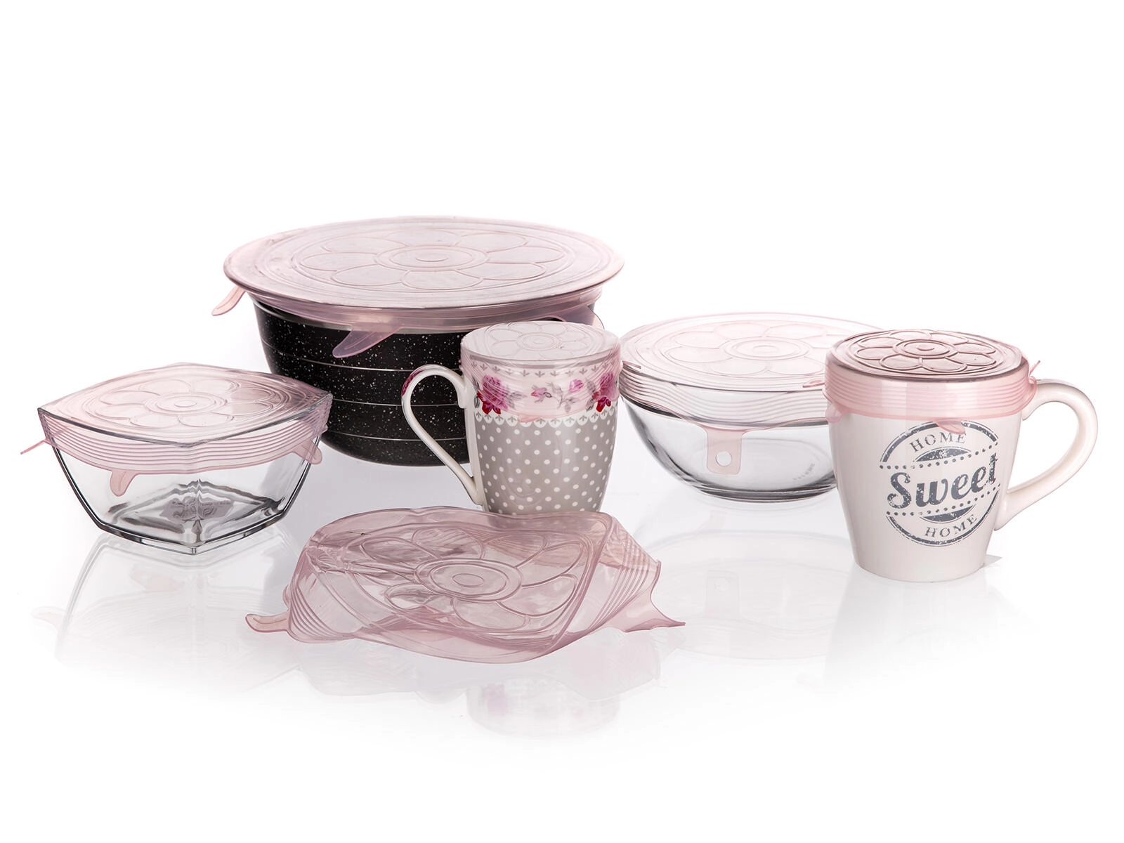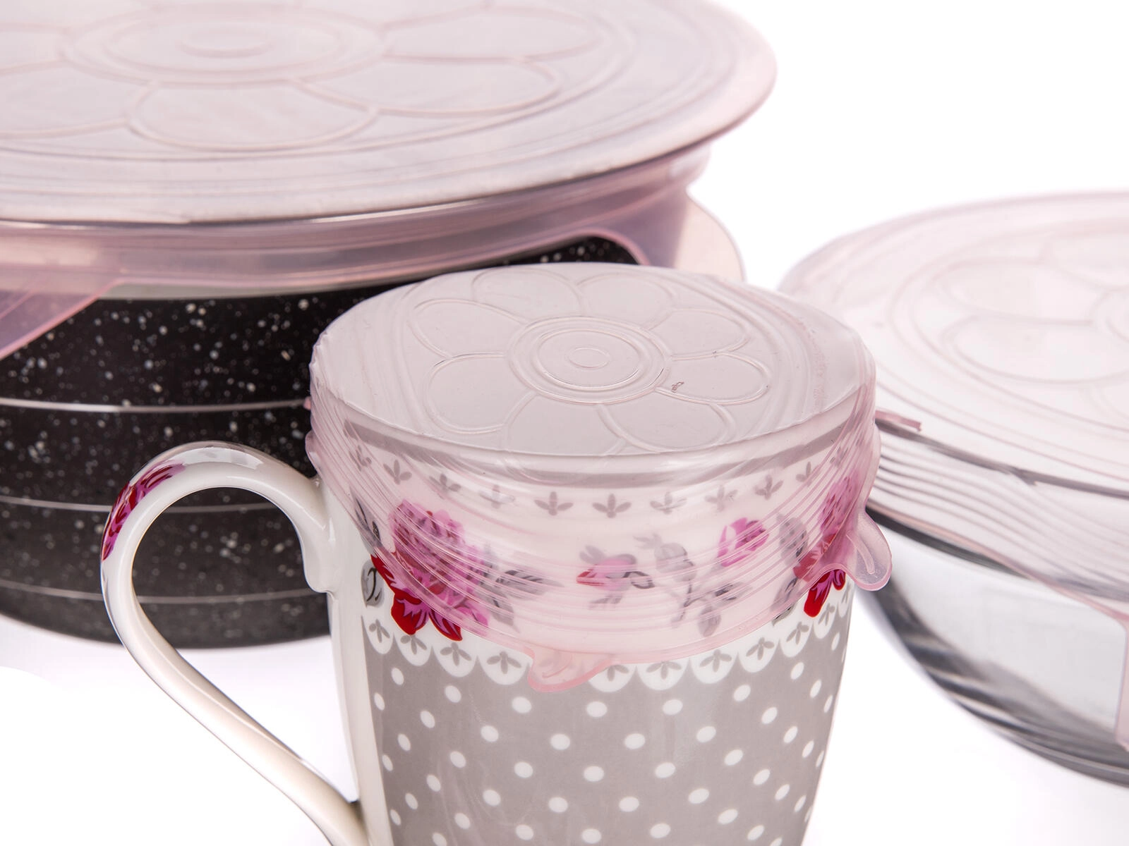 Zes maten dekken mokken, glazen, kommetjes en grote schalen – de deksels rekken eenvoudig mee en hechten aan verschillende vormen.