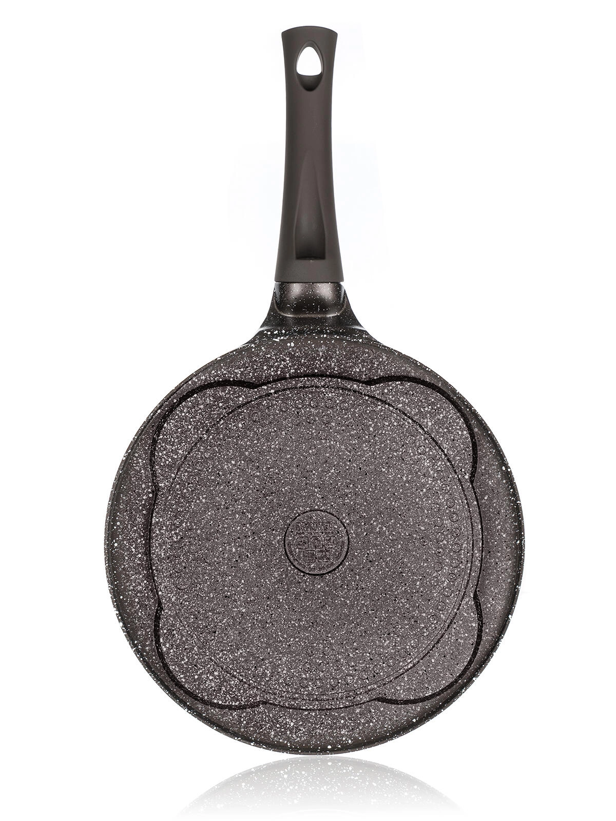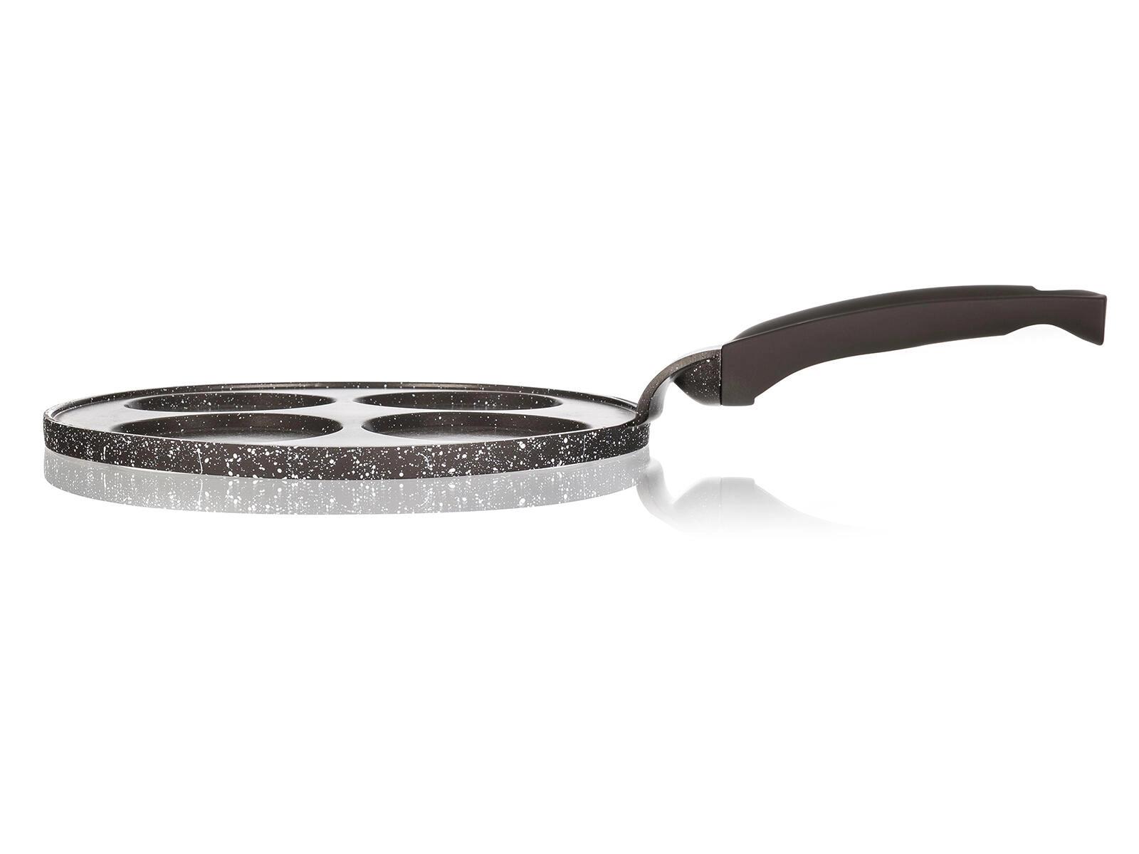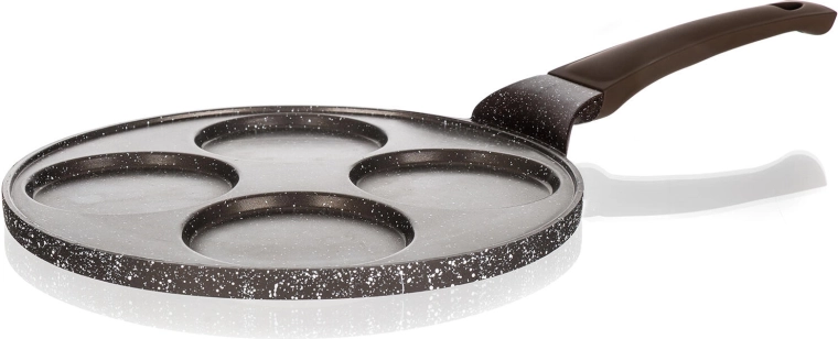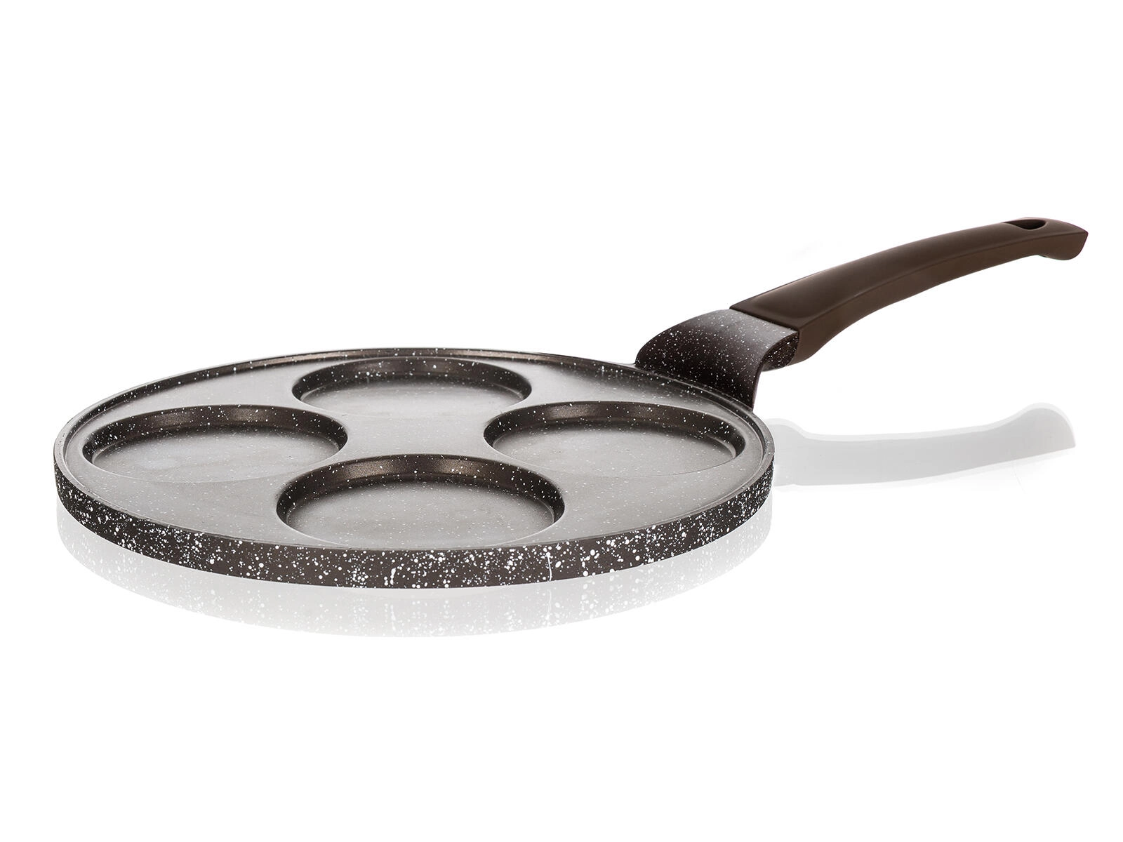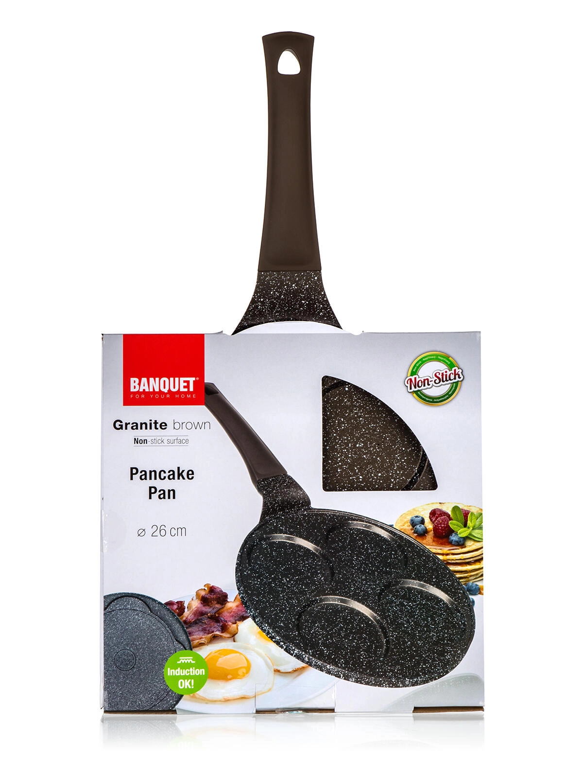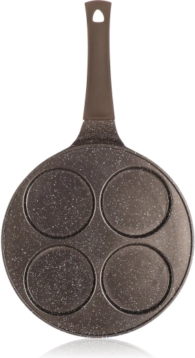 De Granite Brown pannenkoekenpan met een diameter van 26 cm en vier ronde vormen is ideaal voor de dagelijkse bereiding van ontbijt en snelle lekkernijen. Het stevige aluminium lichaam met antiaanbaklaag zorgt voor een gelijkmatige warmteverdeling en eenvoudige loslating van gerechten zonder aanbranden.