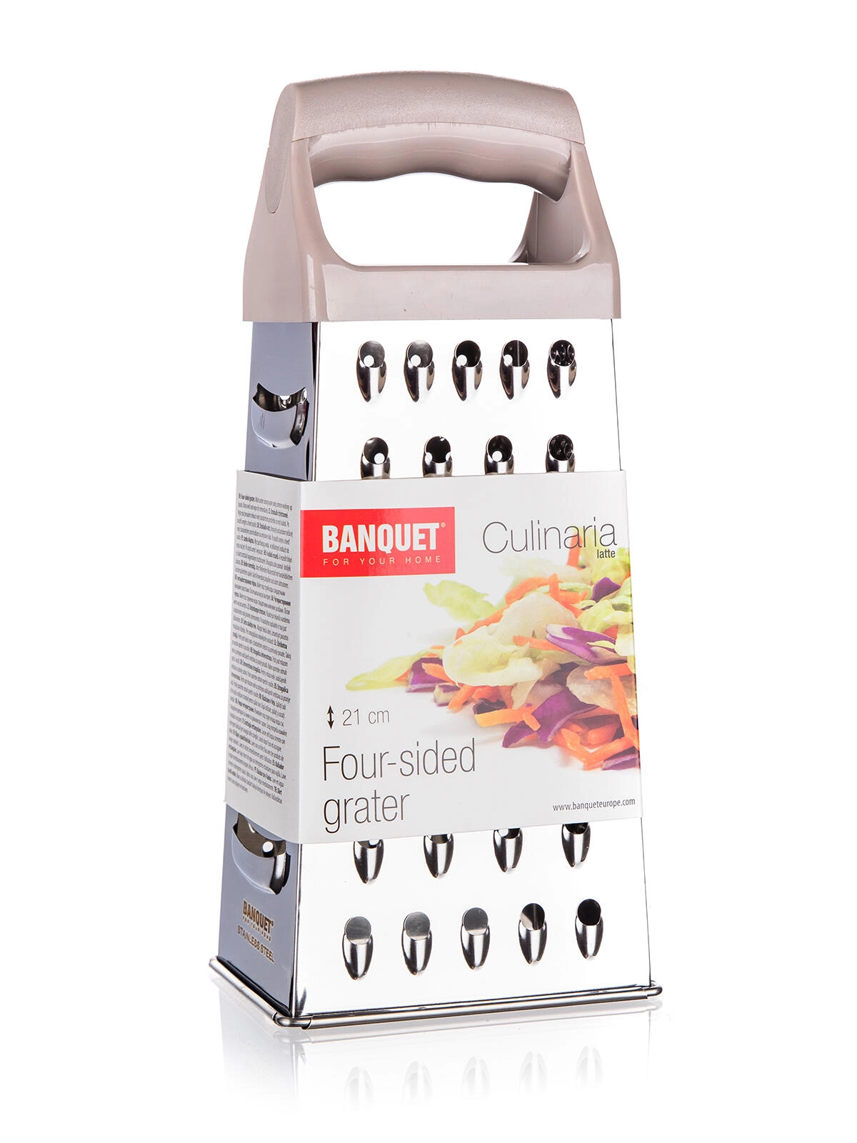 Praktische vierzijdige piramidevormige rasp van roestvrij staal met een hoogte van 21 cm voor het eenvoudig raspen van groenten, kaas en fruit. Biedt een stabiele constructie, een comfortabele kunststof handgreep in latte-kleur en eenvoudig onderhoud.