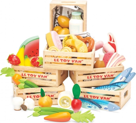 Inclusief klassieke soorten broodjes en zoetigheden in een compacte krat – de perfecte aanvulling voor kinderkeukens en marktstalletjes.