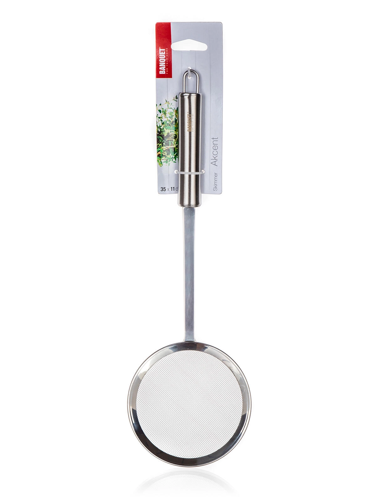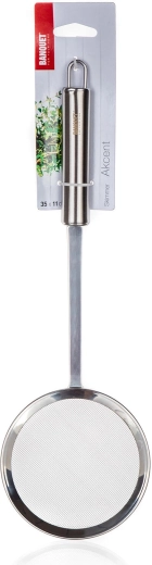 De AKCENT-schuimspaan met zeef is gemaakt van duurzaam roestvrij staal, wat een lange levensduur en eenvoudig onderhoud garandeert. Het dichte gaas vangt schuim en fijne onzuiverheden effectief op en de lange handgreep zorgt voor veilige hantering boven pannen en friteuses.