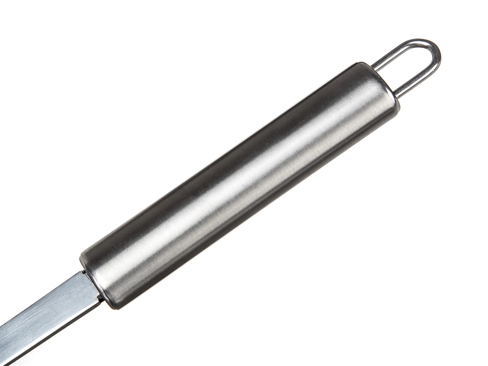 De lange, robuuste handgreep met ophangoog zorgt voor een comfortabele grip, veilige afstand tot hitte en praktisch ophangen aan een rail.