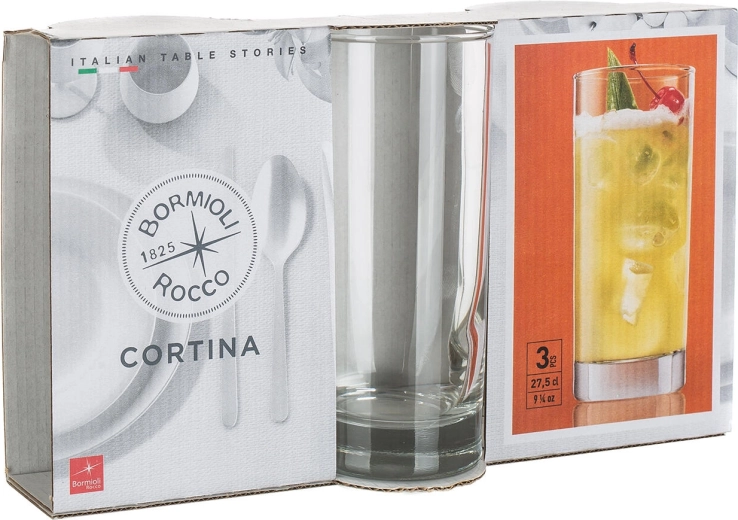 De Cortina-glazen met een inhoud van 275 ml kenmerken zich door een strak, minimalistisch design dat past in elk huishouden en in de horeca. De robuuste, dikke bodem zorgt voor uitstekende stabiliteit, terwijl de gladde rand aangenaam drinkcomfort biedt.