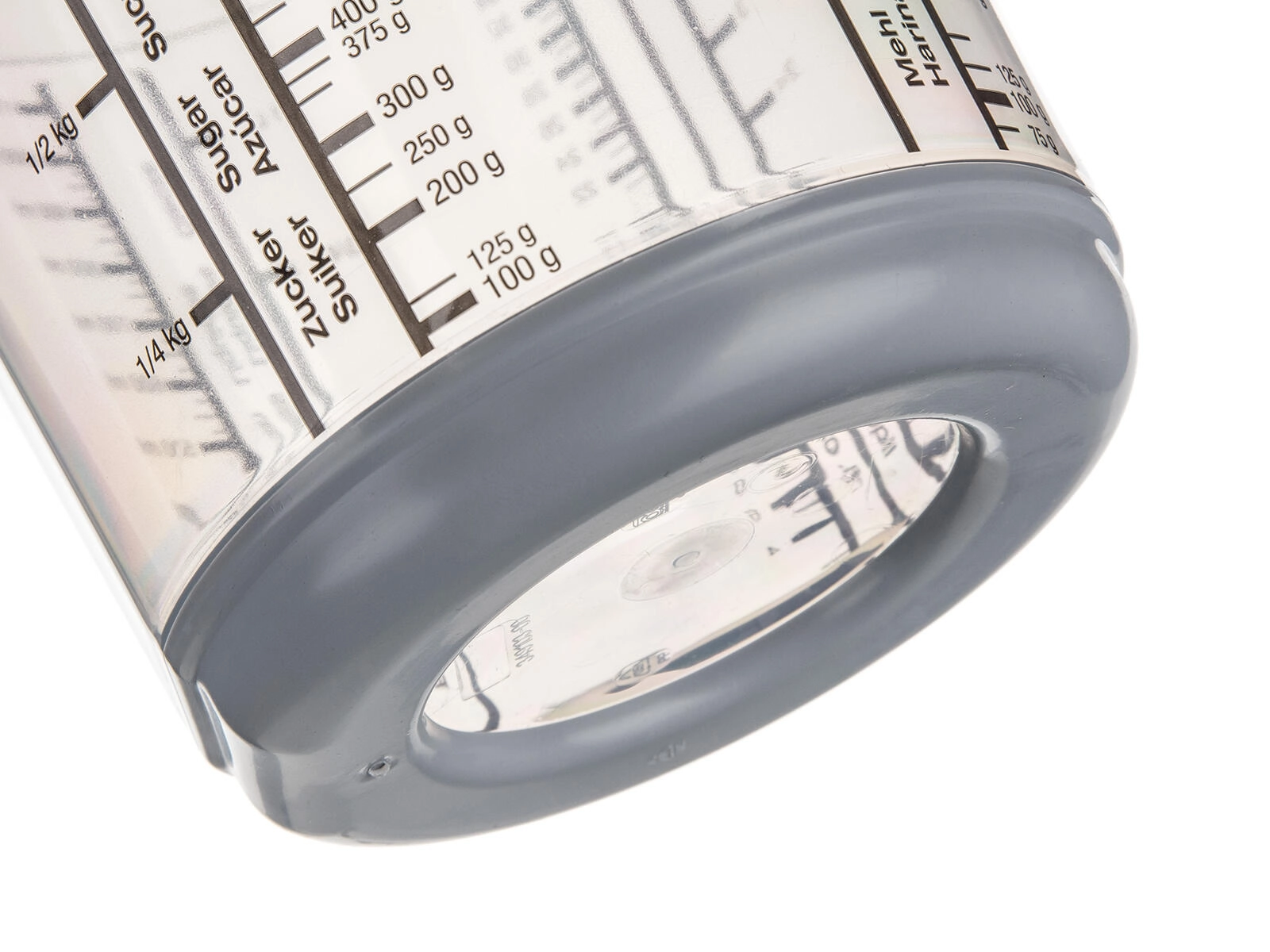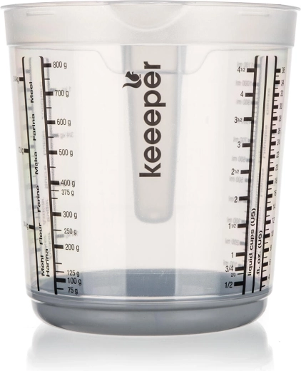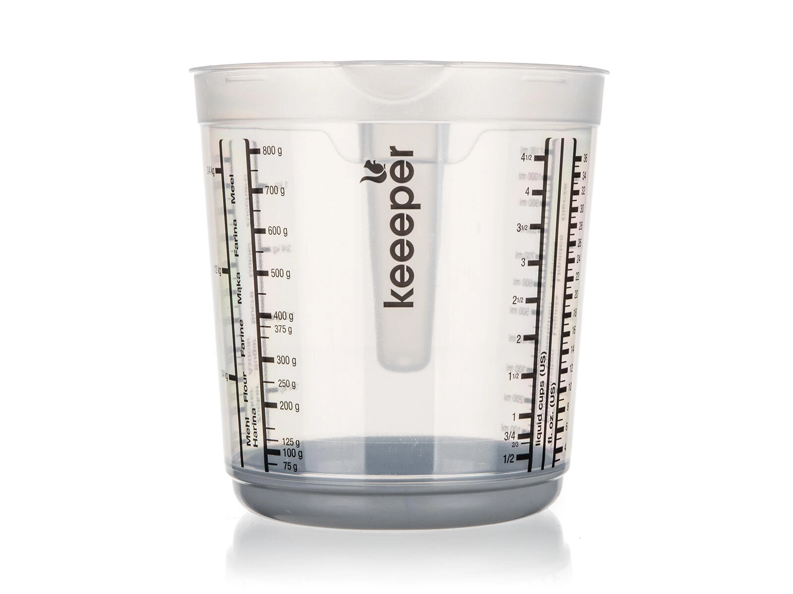 Zwarte, goed leesbare markeringen voor snel en nauwkeurig afmeten van zowel vloeistoffen als droge ingrediënten in meerdere eenheden.