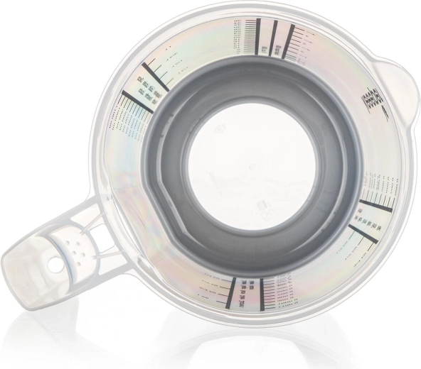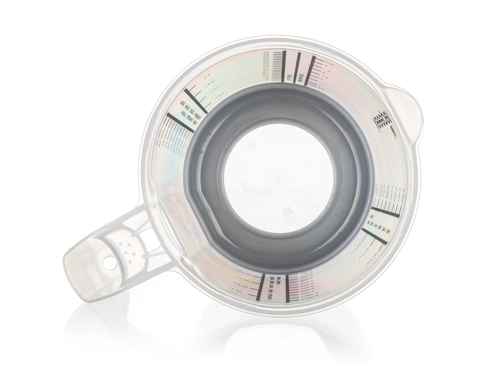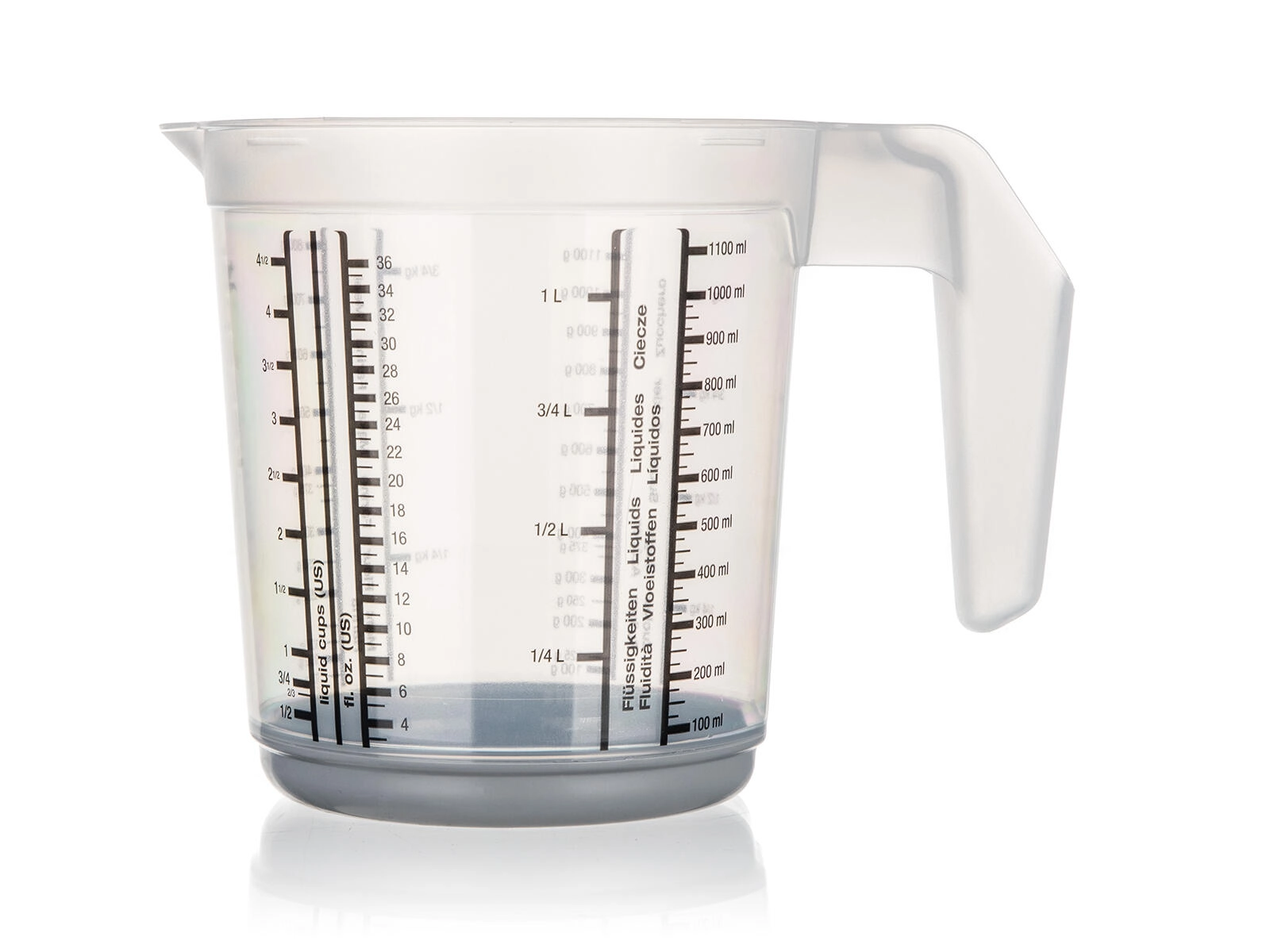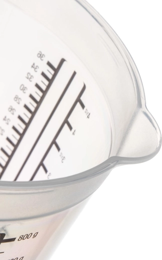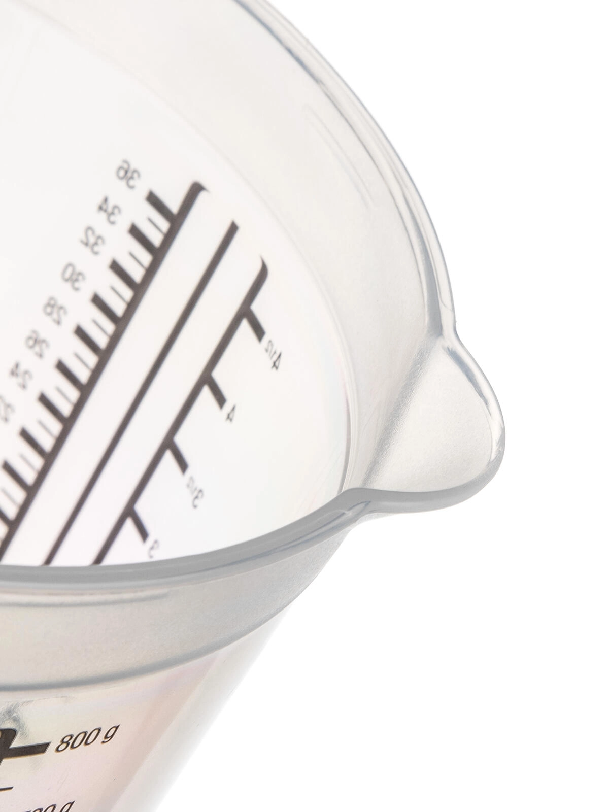 Schalen in verschillende maateenheden zorgen voor precisie zonder tijdrovend omrekenen. De hoge rand en de gevormde schenkrand helpen bij schoon en vloeiend schenken zonder druppelen.