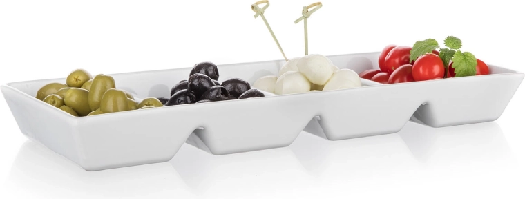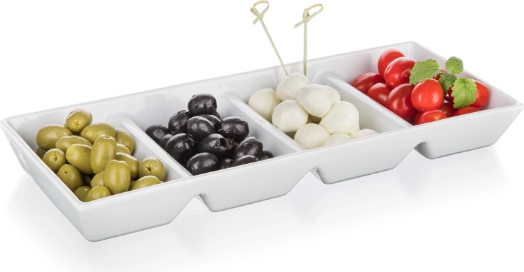 Vier vakken houden lekkernijen overzichtelijk gescheiden – ideaal voor olijven, mozzarella, tomaten, noten of dips. Geen vermenging van smaken, een strakke presentatie.