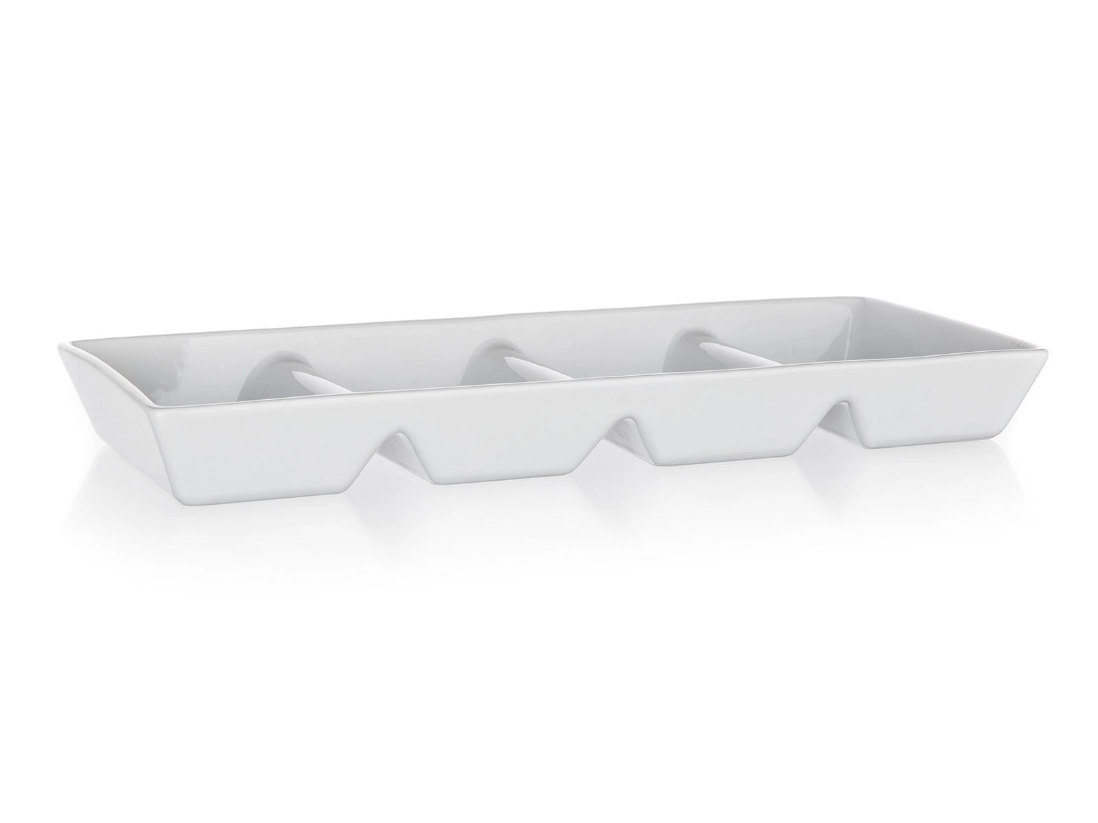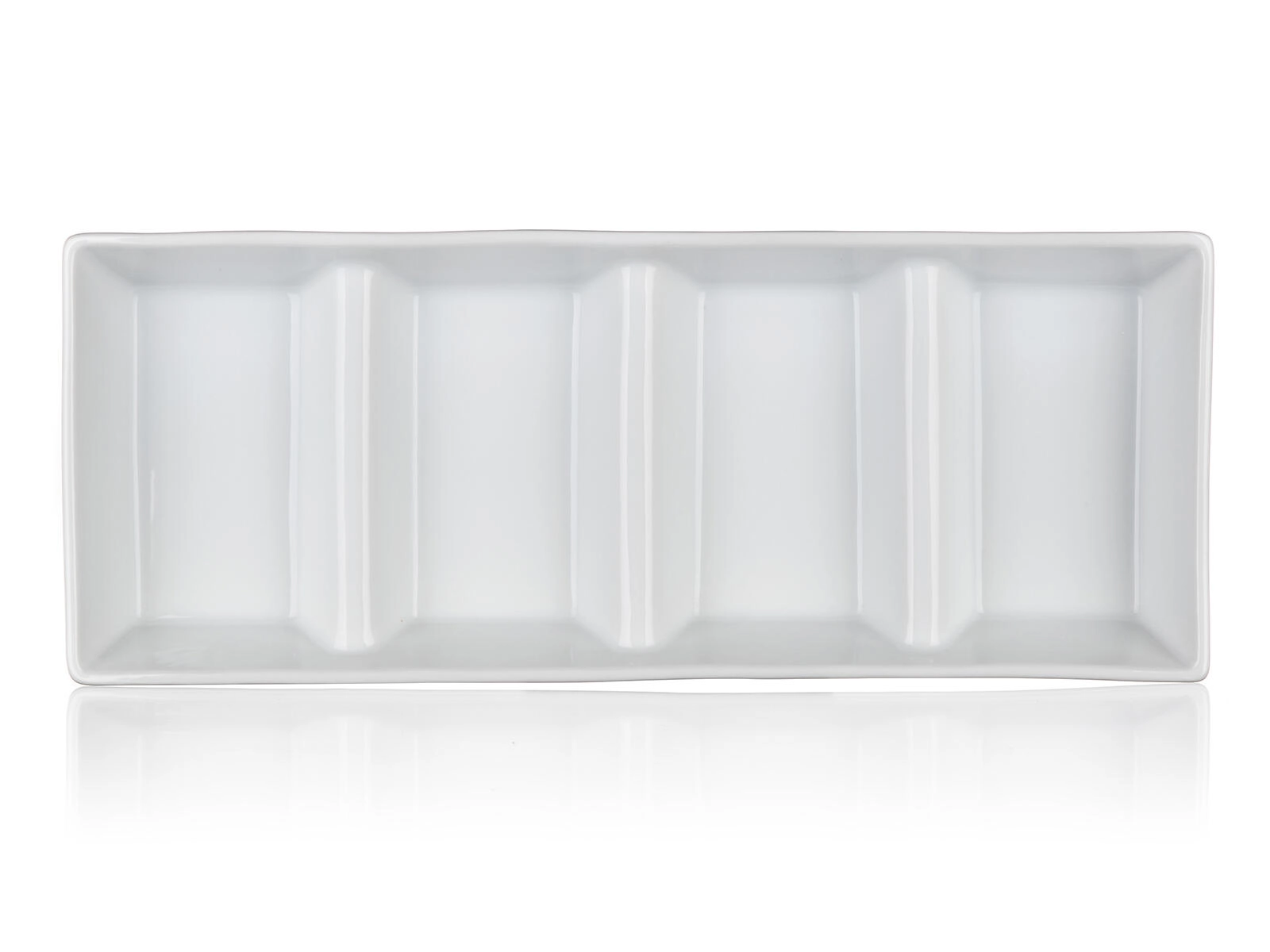 Ontdek het praktische karakter en het strakke design van de BIANCA serveerschaal. Vier gescheiden secties maken een stijlvolle en hygiënische presentatie van diverse snacks mogelijk zonder smaakvermenging. Tijdloos wit en minimalistische lijnen accentueren elke tafel – van een snelle snack tot een feestelijke hapjesschaal.