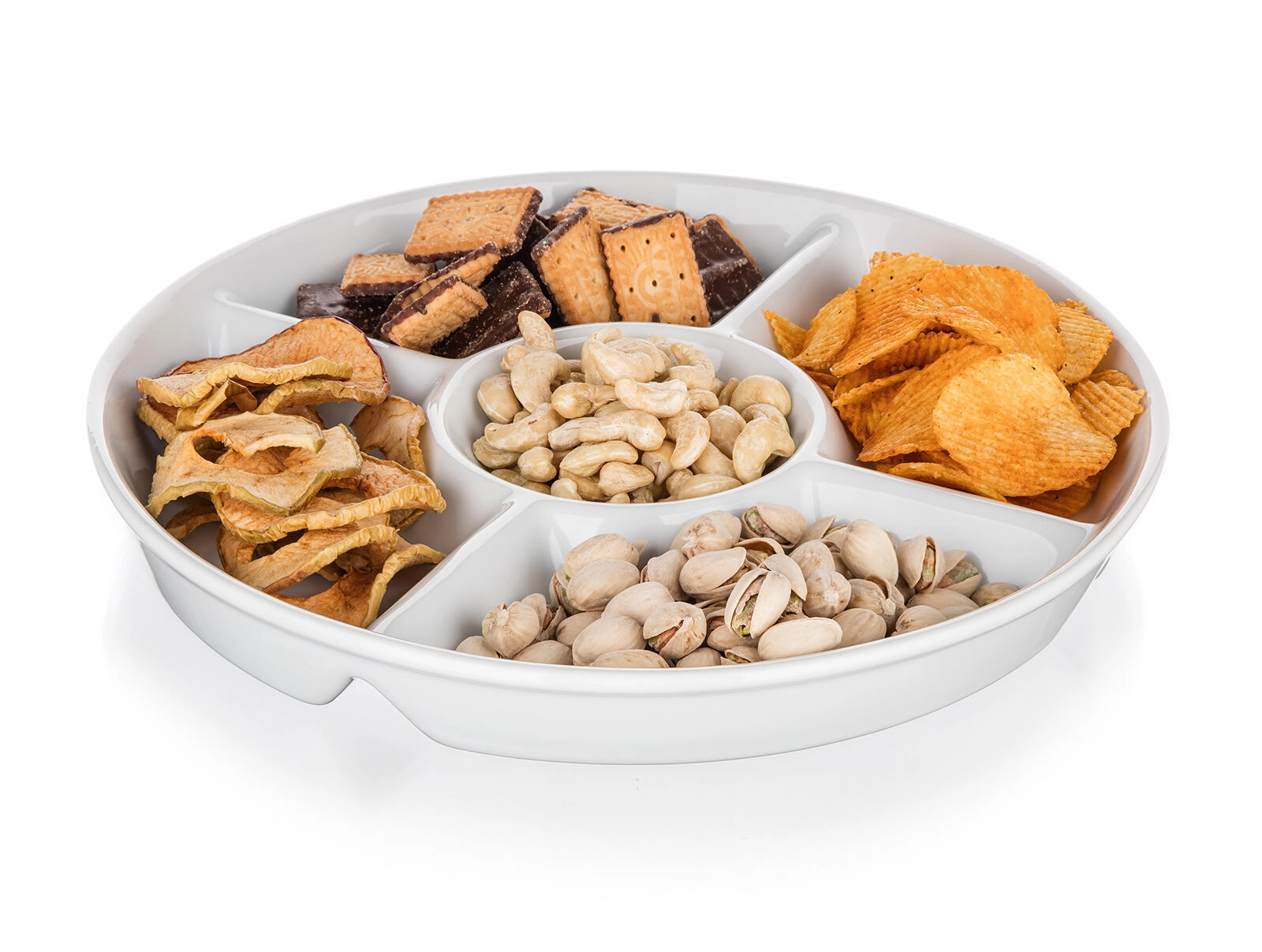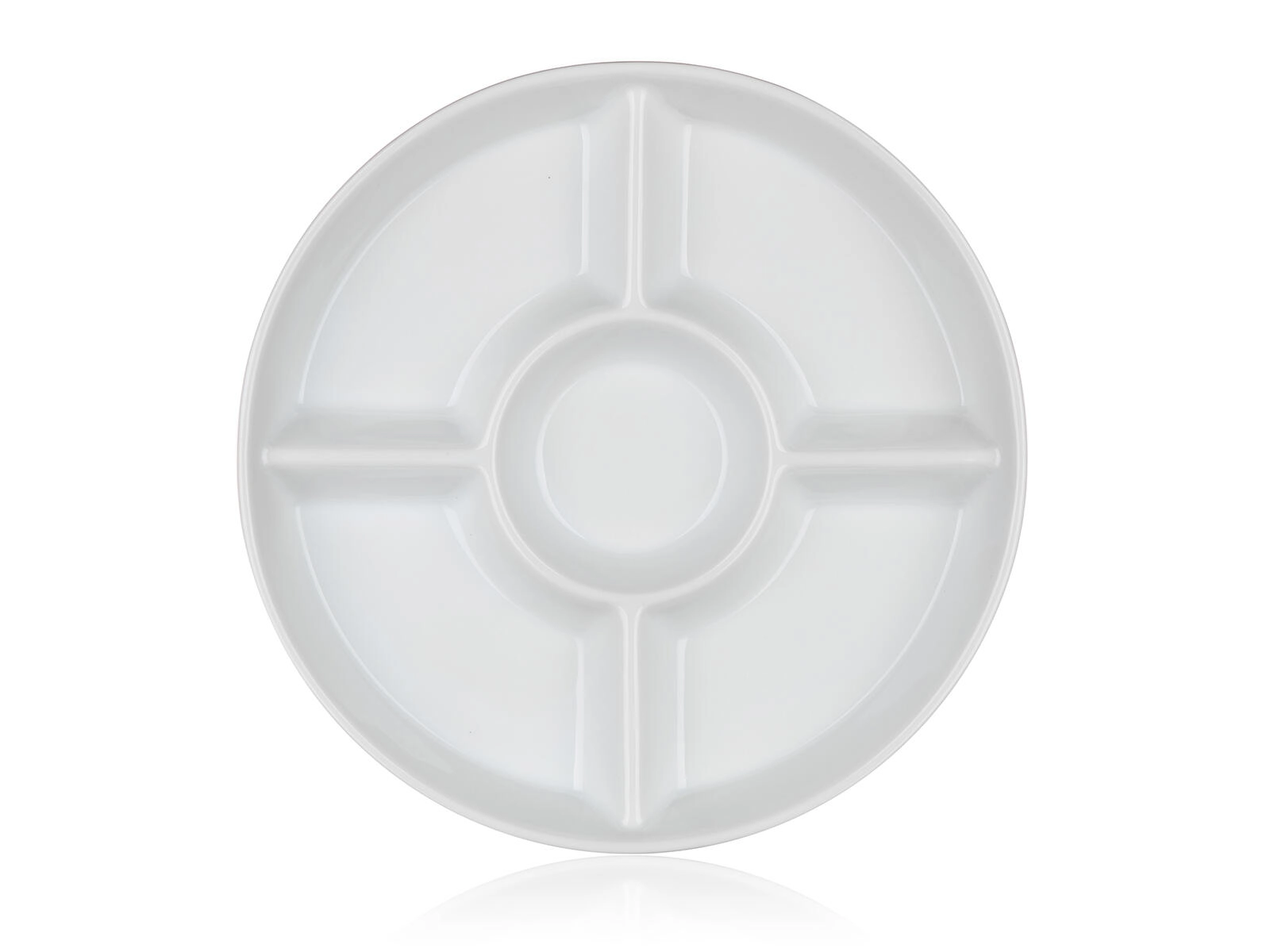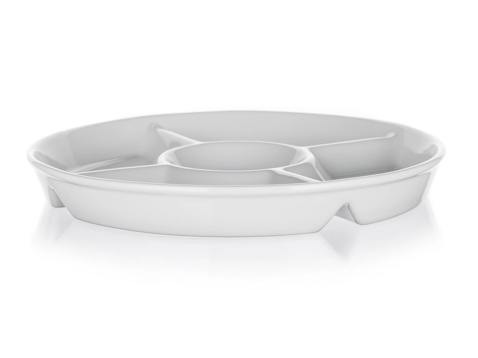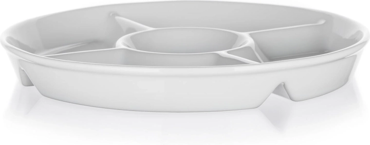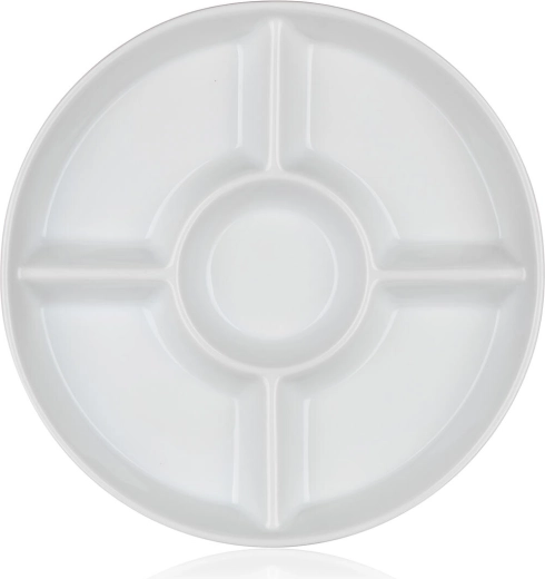 Elegante gedeelde serveerschaal van hoogwaardig porselein BIANCA met een diameter van 30 cm in een universele witte kleur. De praktische indeling in secties houdt smaken gescheiden – ideaal voor dip, noten, chips, fruit en groente. Eenvoudig te onderhouden, vaatwasmachinebestendig en perfect voor dagelijks gebruik én feestelijkheden.